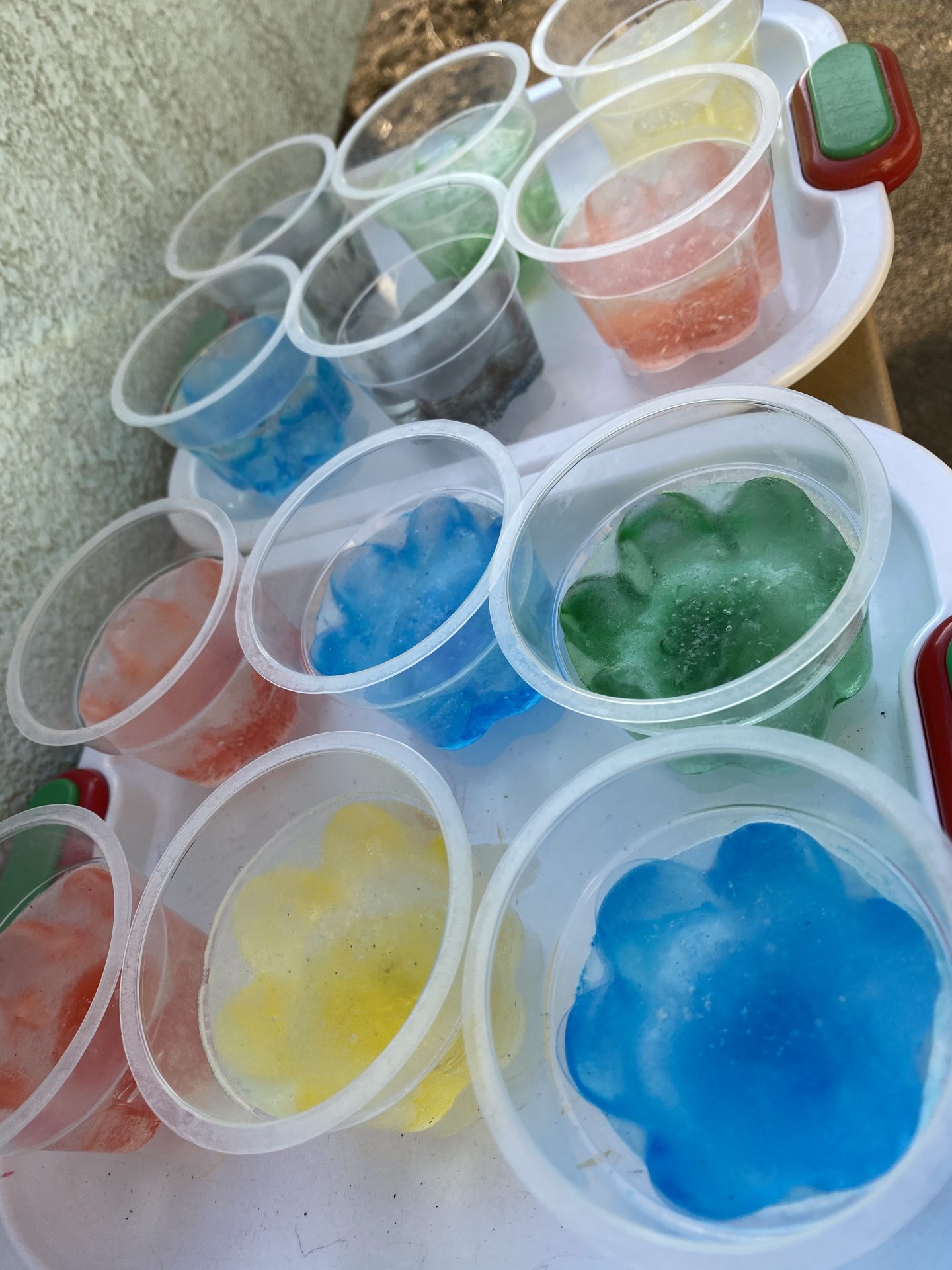 金曜日の日、カップにカラフルな色水を作り、外の日陰に置いて、
