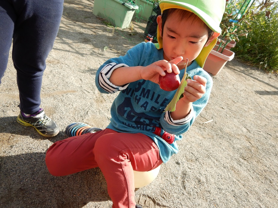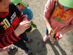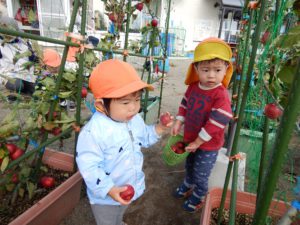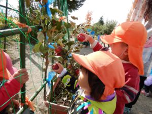 ほし組さんとつき組さんはプランターにリンゴの枝をつけてリンゴ狩り