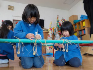 出来上がった大根を干しかごに入れたり、物干し吊るしたりしました。