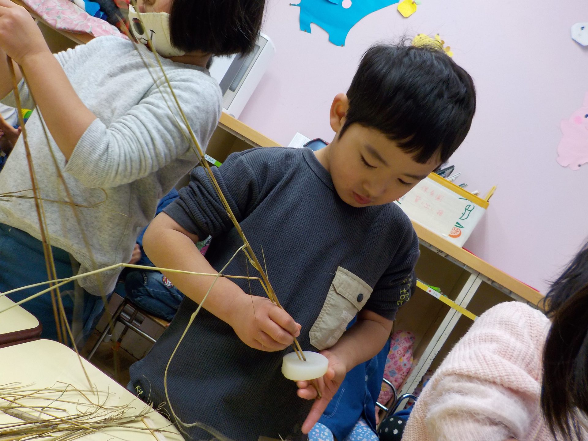 ワラを通します。まだ温かい大根にワラがスウッと入っていきます。