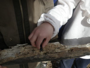 松枯れ材の木材を見つけ木の枝で掘り続けていたら、