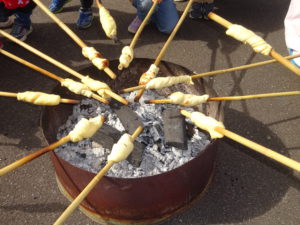 生地が膨らむと、今度は「竹の棒に巻き付けるのです」