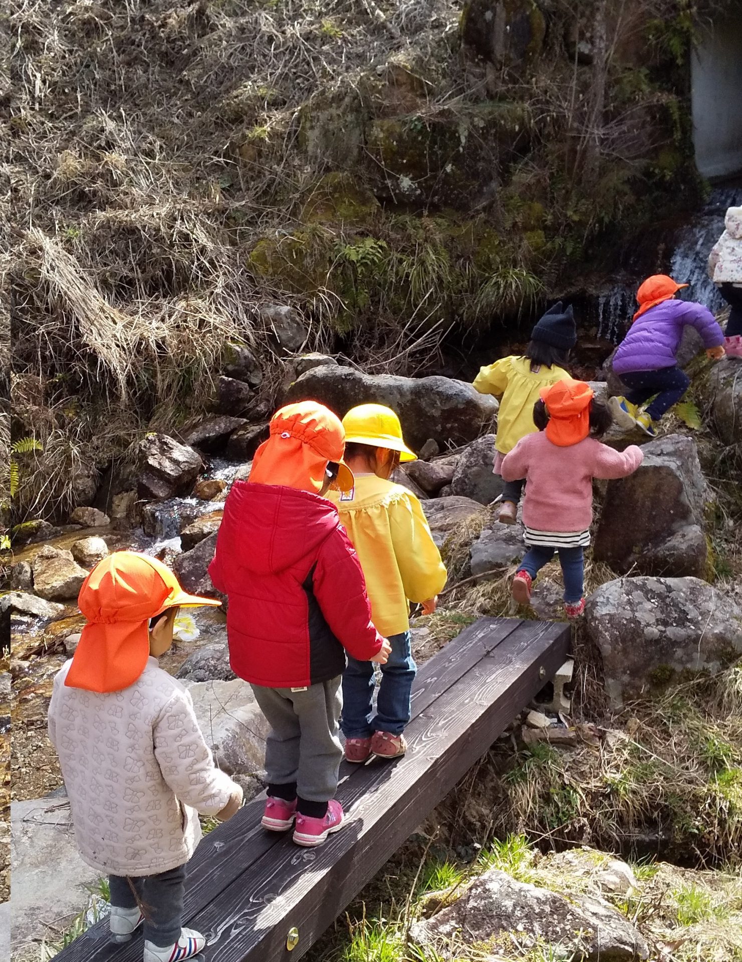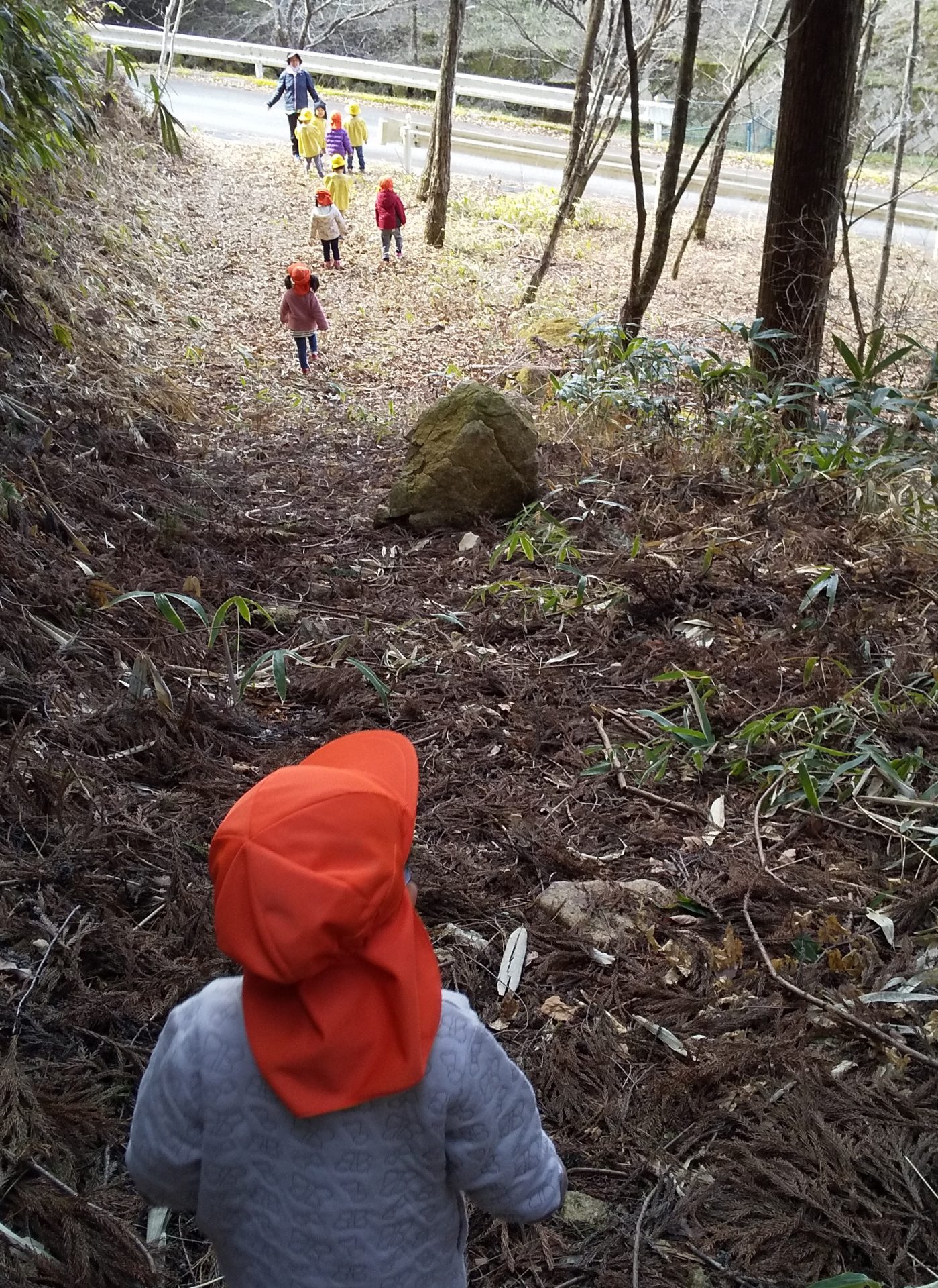 森に入ったり、土手を登ったり、側溝の落ち葉を踏みしめたり今の季節、まだ草が生い茂る前だからこその遊びを楽しむ予定でした。その中で子どもが日陰の寒さや薄暗さと日向の明るさや温かさを体で感じて遊ぶ姿は予想外の体験でした。