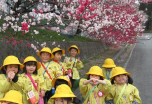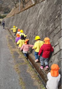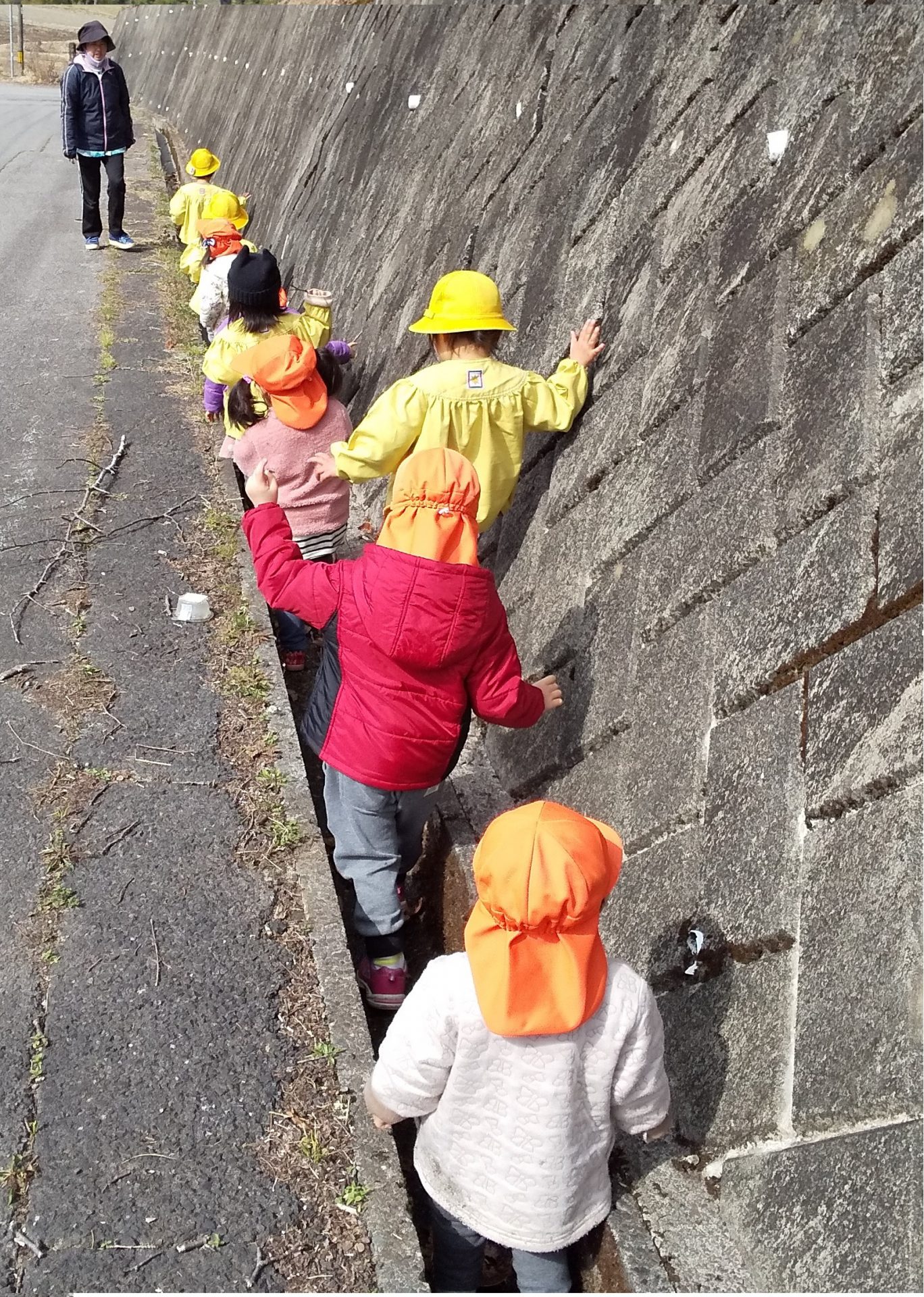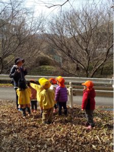 3月の暖かな日、未満児さんと年少さんと一緒にお散歩に出かけました。