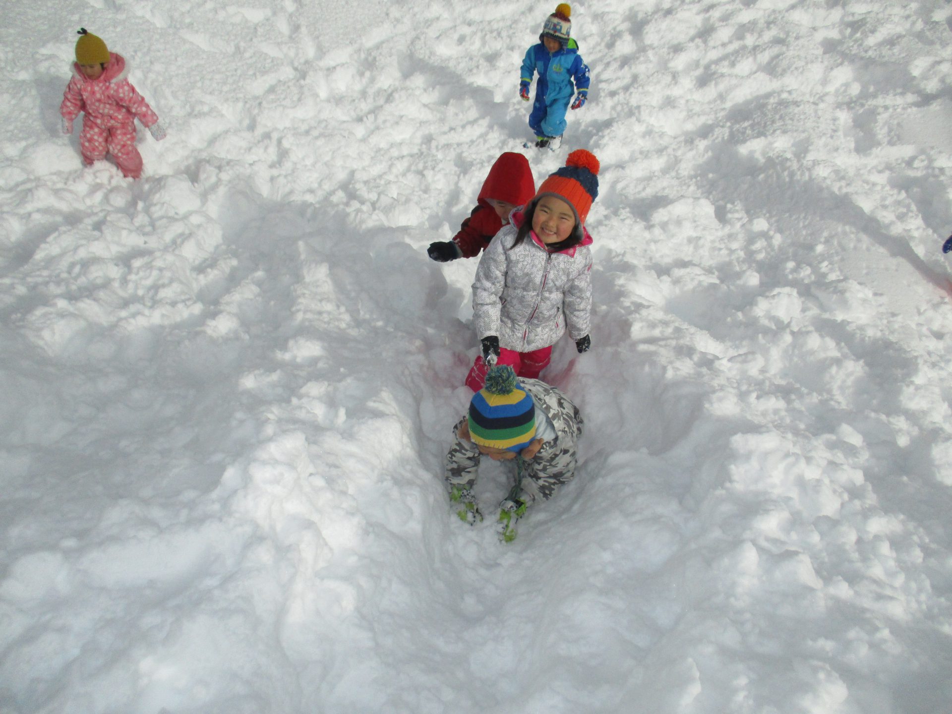 再び積もった雪に大興奮の子どもたち。給食の時間いっぱいまで、たっぷり遊び尽くしました。「明日も、今日の続きしたいな」「ご飯食べる時に、雪合戦もチームで食べようよ。そしたら、作戦会議できるんじゃない?」5歳児を中心に、活動が終わってもなお繋がりを持ち、その活動を深めているようでした。