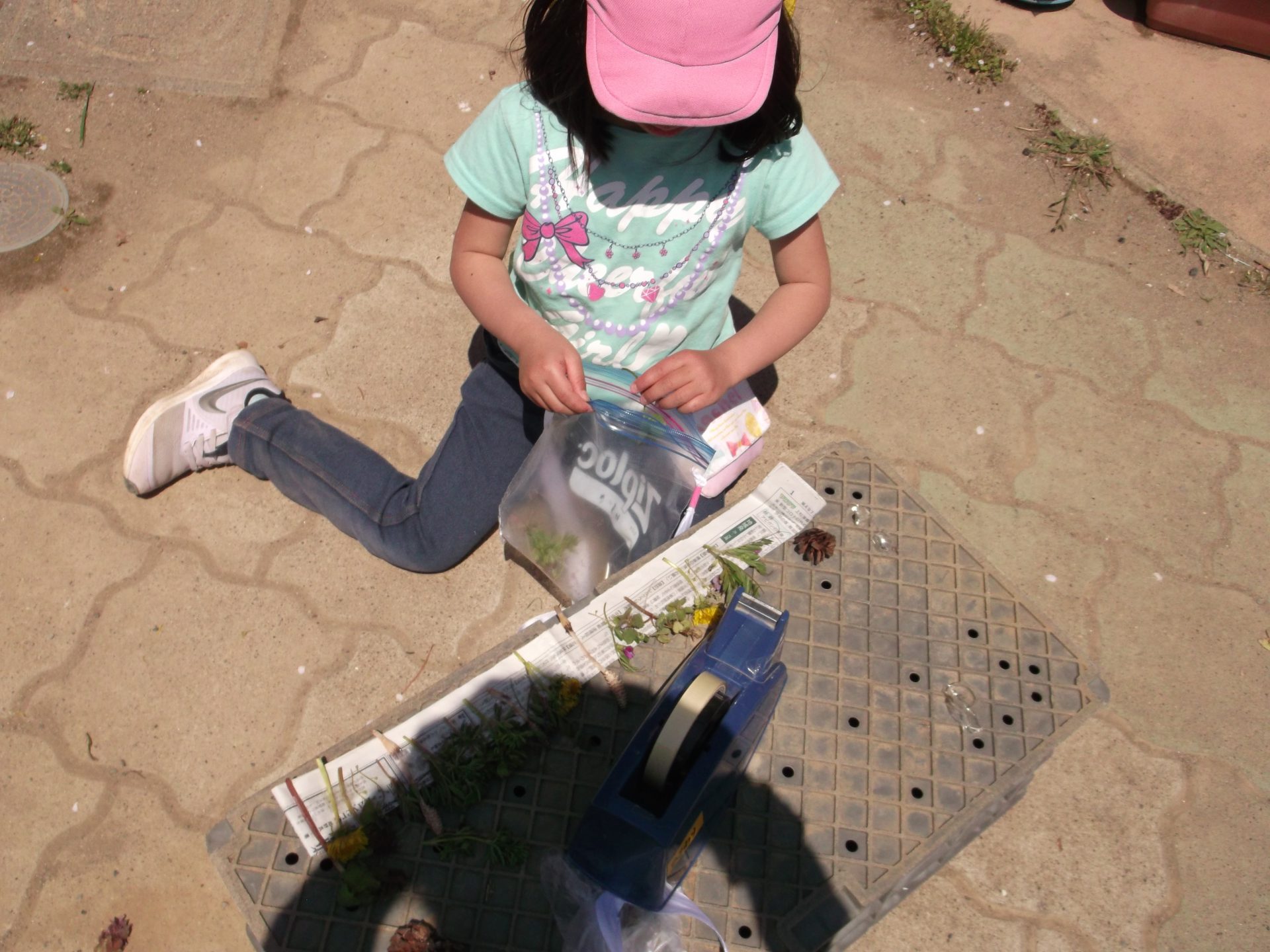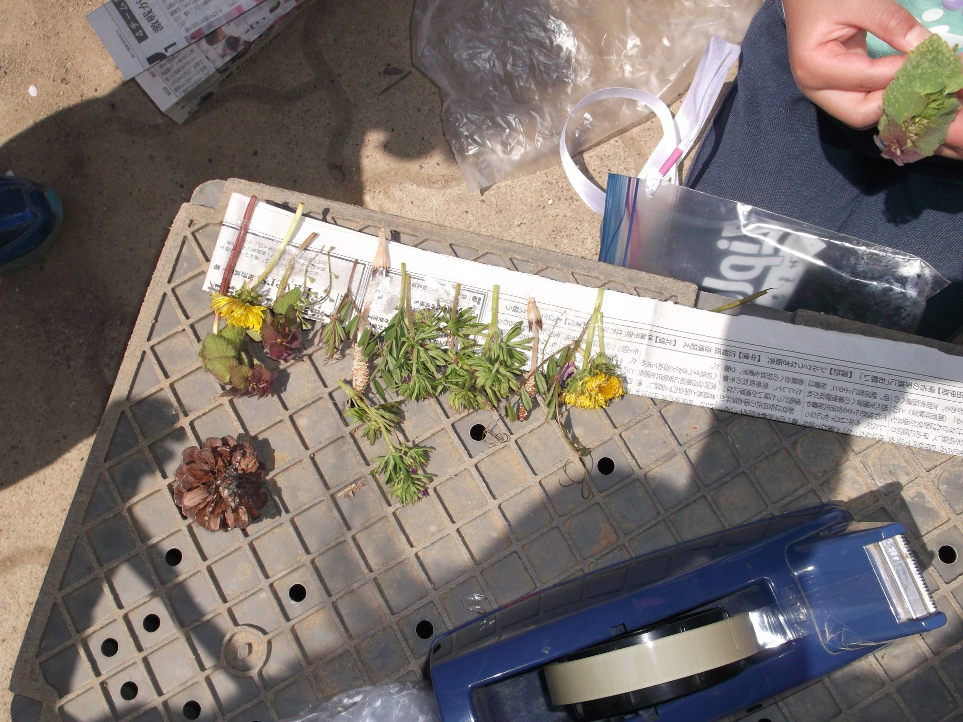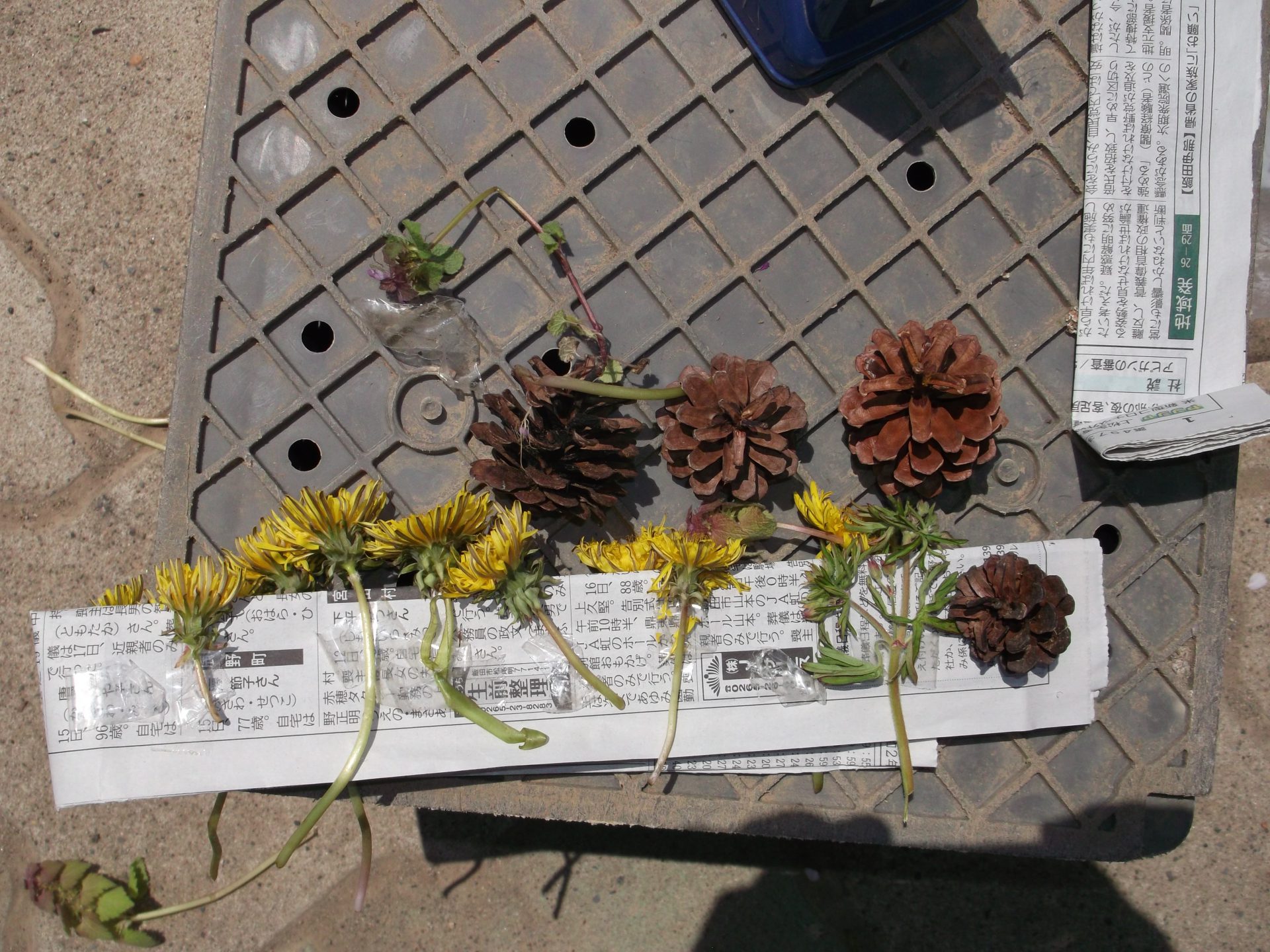 年少組さんと大方神社へ行って松ぼっくりや、道中でたんぽぽ、ヒメオドリコソウ、ナズナなど摘んできました。