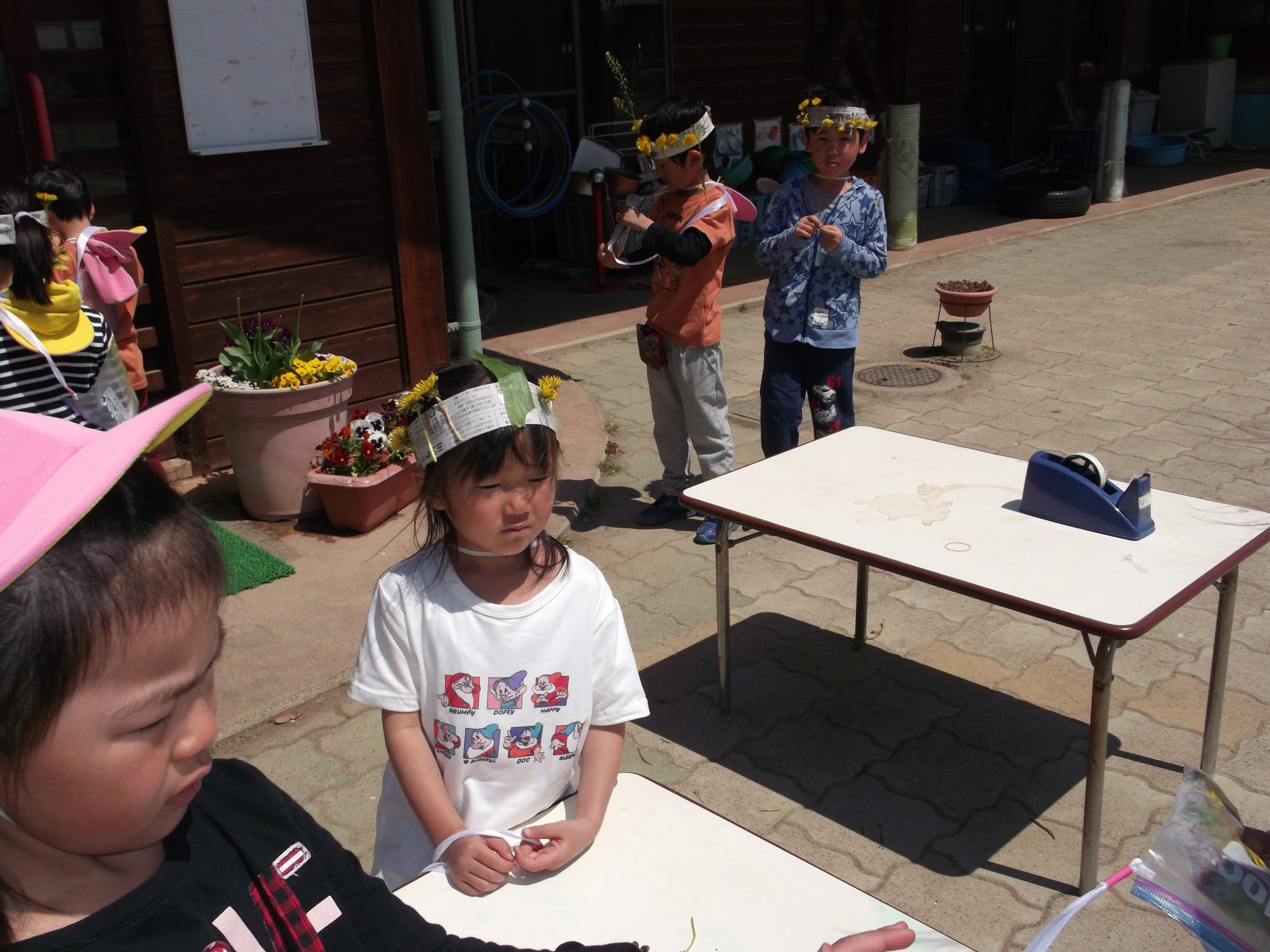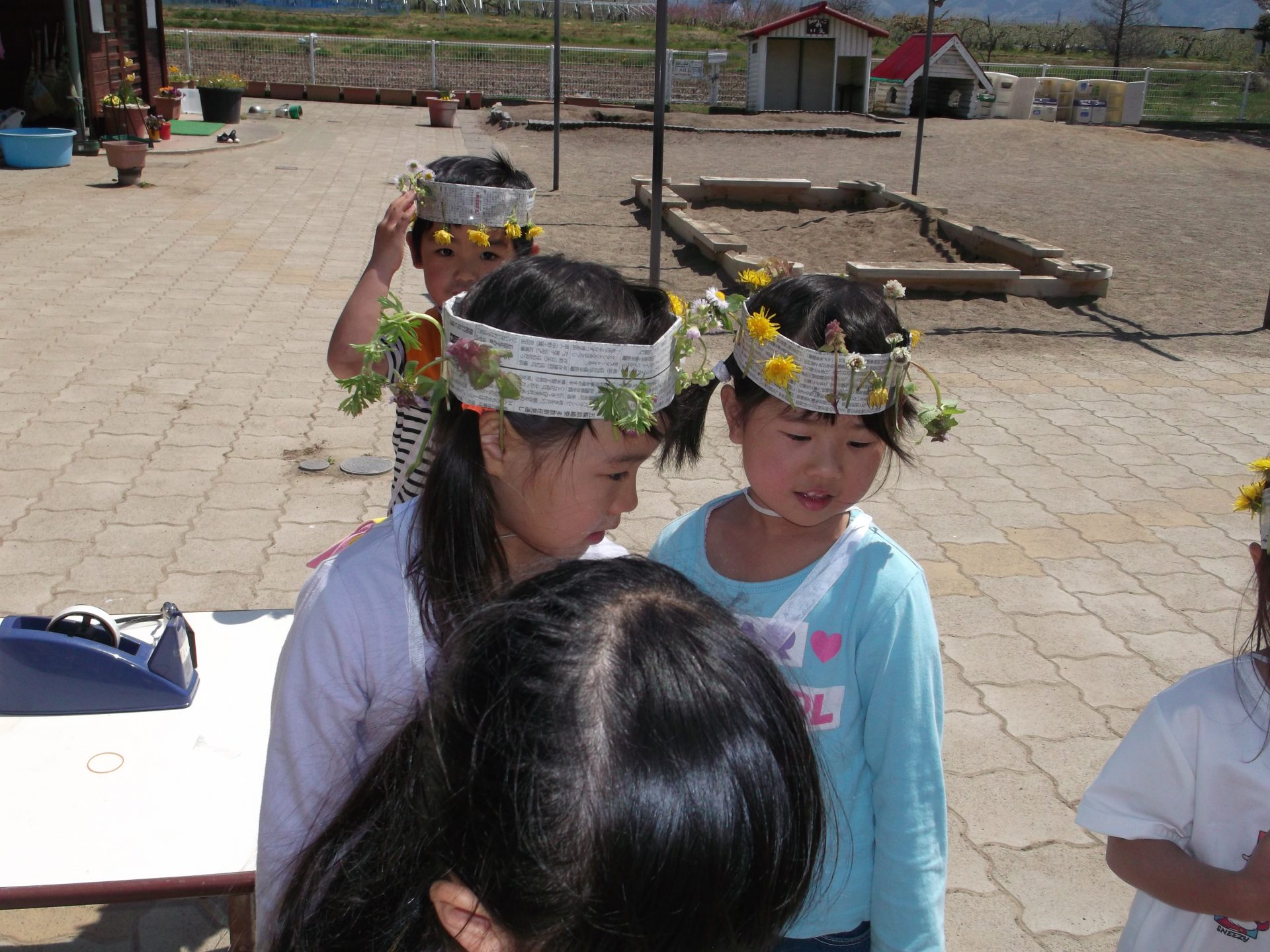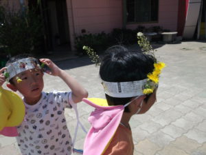 子どもたちが、去年の活動を覚えていて「お花、たくさんあるから、また冠作ってみようか」と考えついたところがすごいなあと思いました。そして、「花が足りないから、そこでとってこよう。桜の花びらも飾ってみよう」自分たちでどんどん準備することも大したものだと思います。自分たちの考えをどんどん示して楽しい園生活をしていってほしいです。