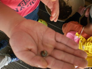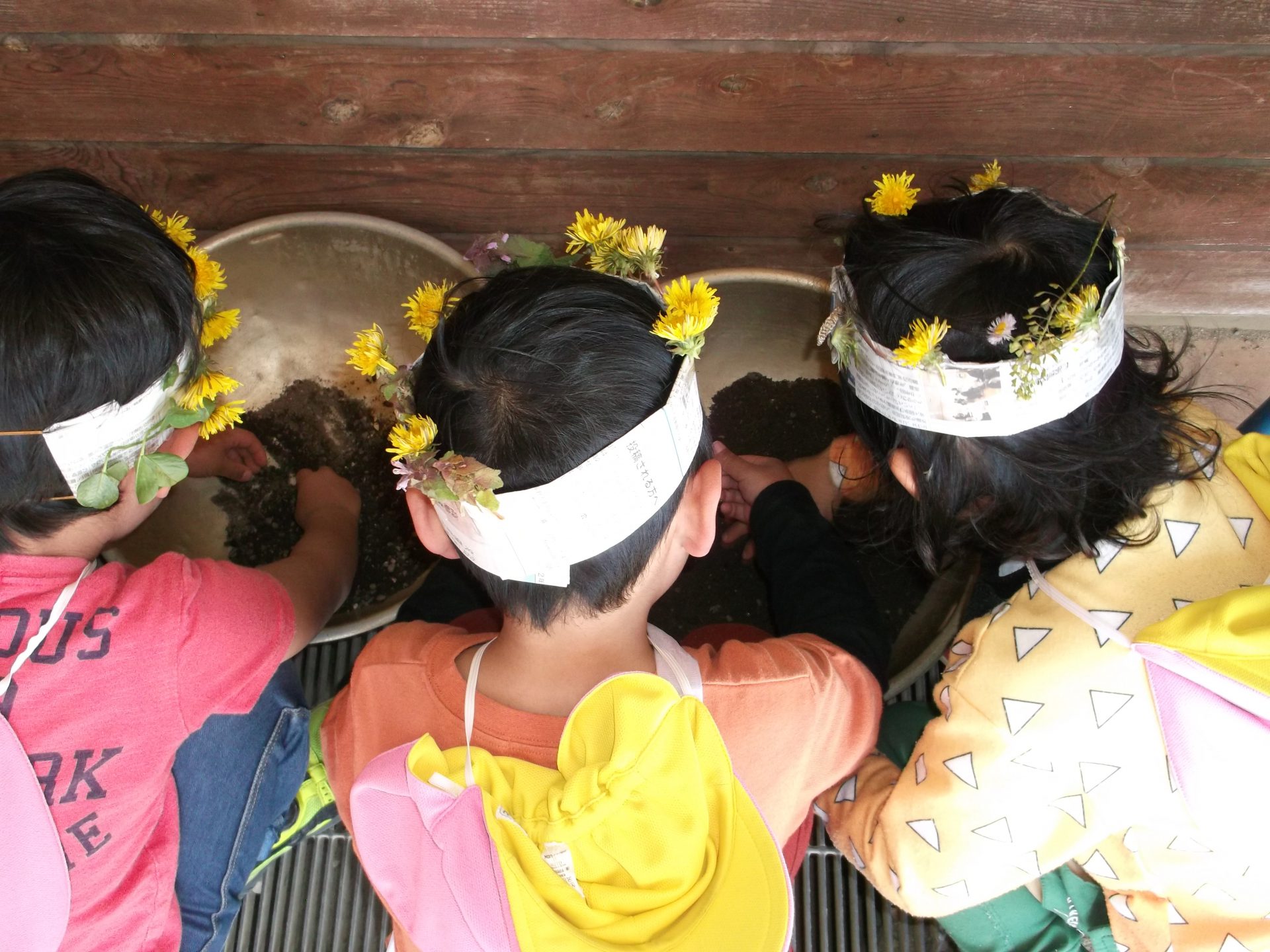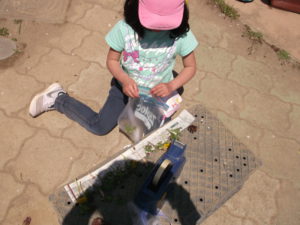 子どもたちの大好きな虫たちも出てきます。園庭で見つけた小さな幼虫を土が入ったボールに入れ、出来上がった花の冠をかぶって真剣な表情でみんなでのぞき込んでいます。これから飼うのかな?