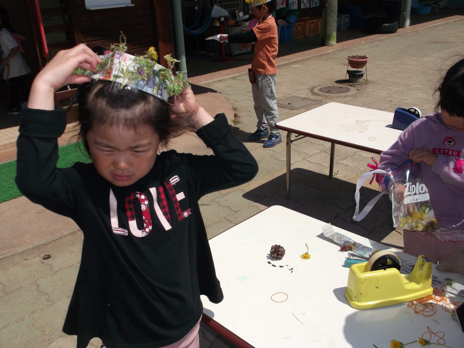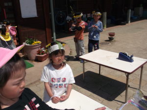 去年の活動を覚えていて「また、冠作りたいね」ということで自分たちで新聞を折ったりして準備しました。