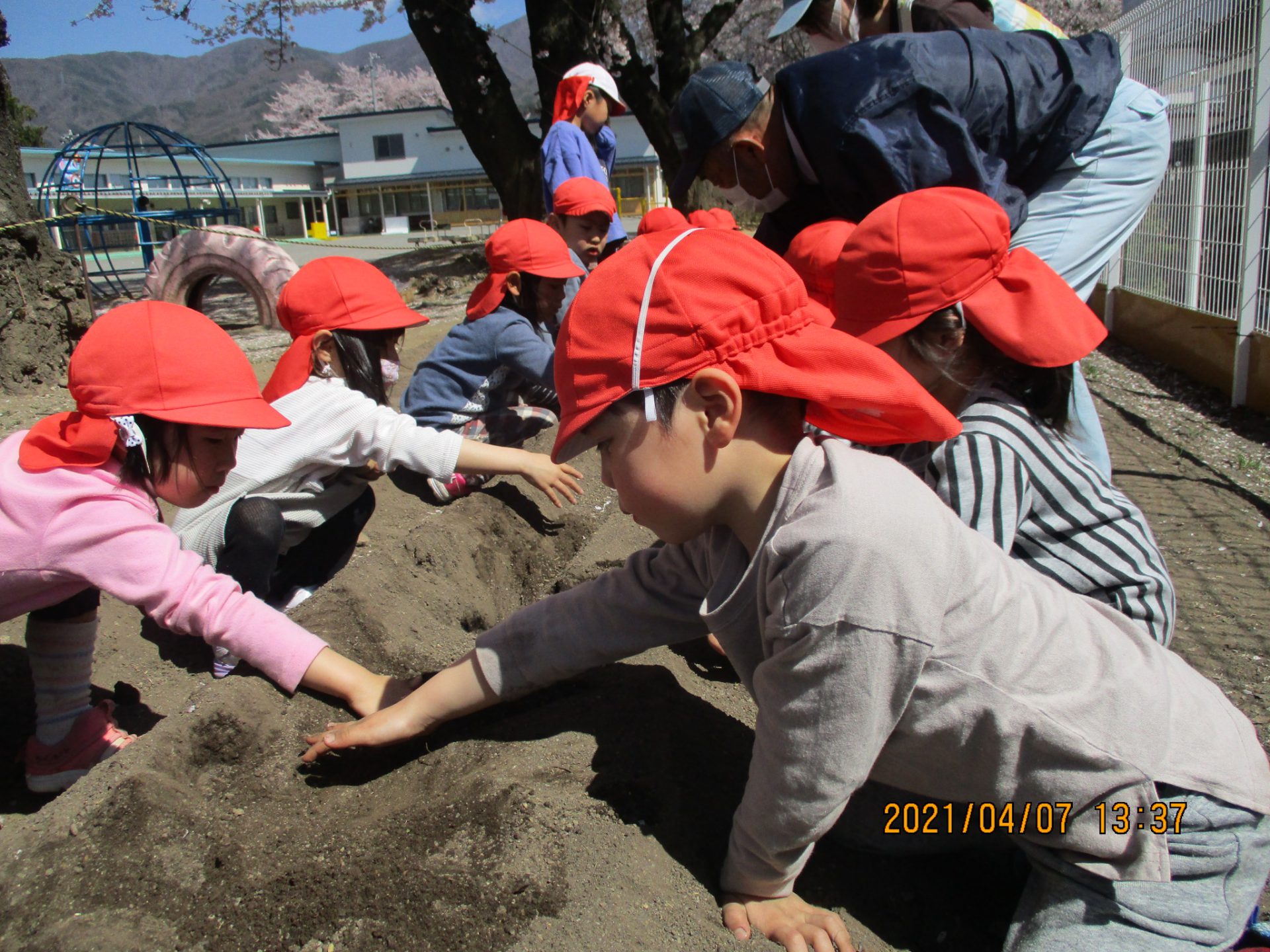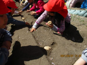 じゃがいもがしっかり埋まる深さまで穴を掘ることが意外と難しかったり、どうしたら美味しいじゃがいもになるのかなど、実際に植えてみることで色々な事を感じた子ども達です。