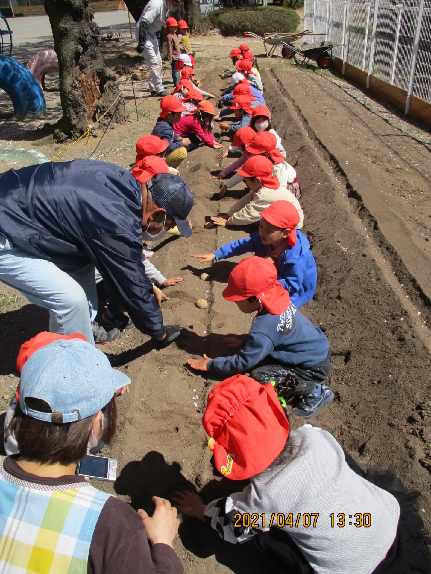 先日、年長組の子ども達が園の畑にじゃがいもを植えました。子ども達は喜んで畑に集まり、植え方を教えてくれた園バスの運転手さんのお話をよく聞いて、男爵とメークインの二種類を植えました。