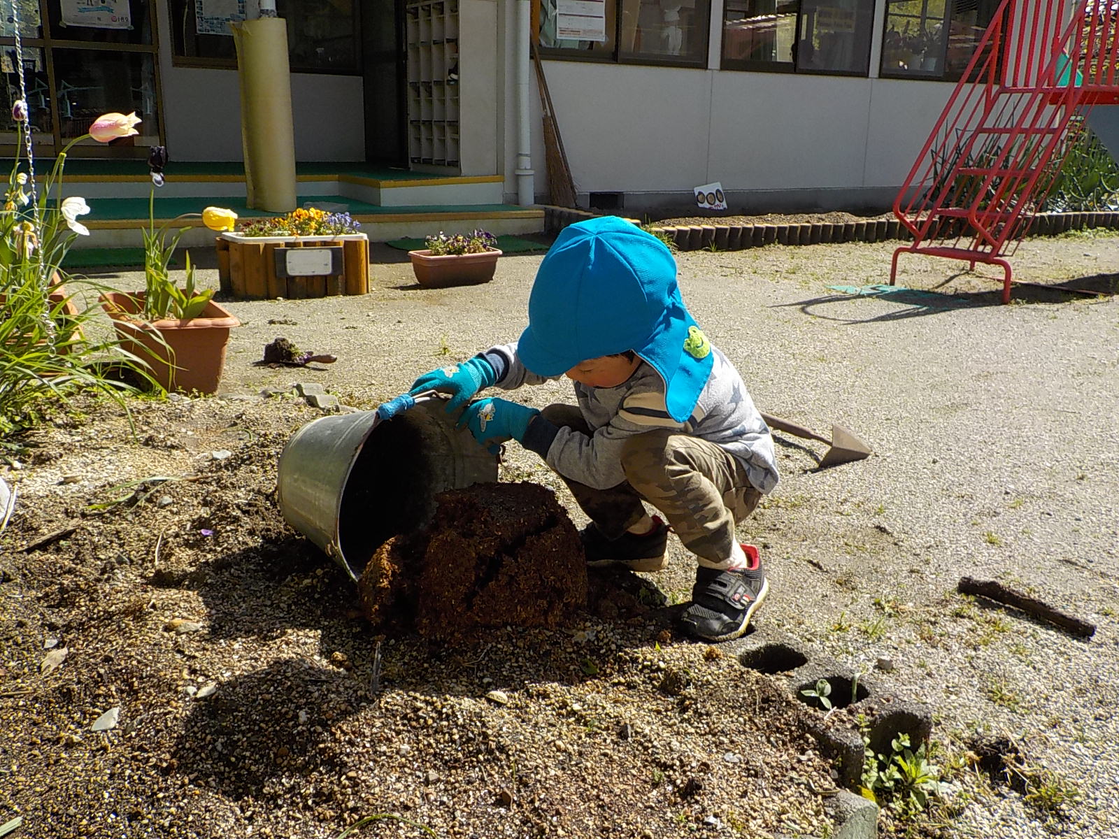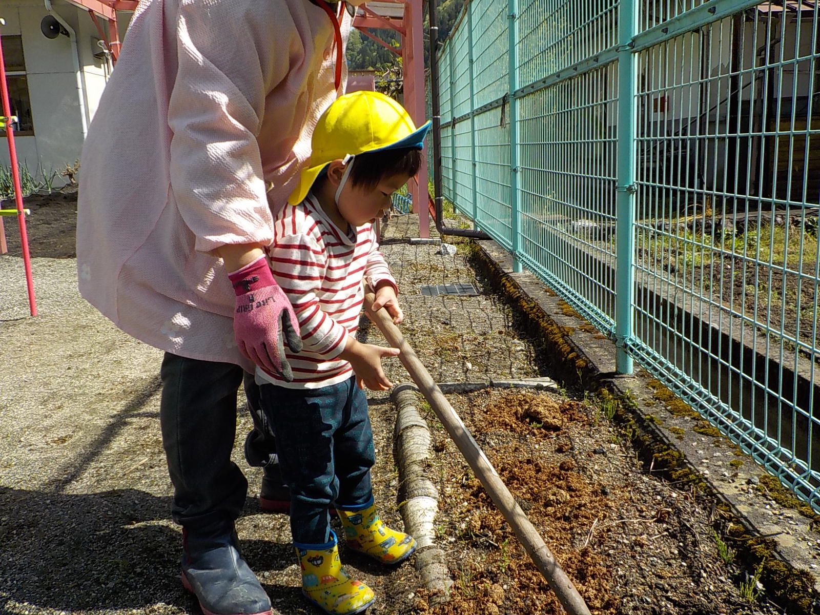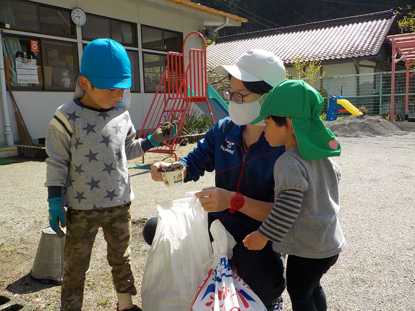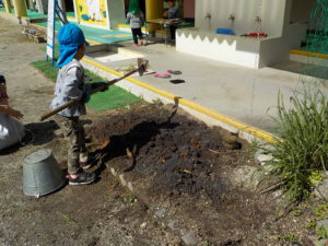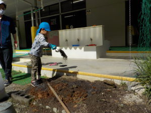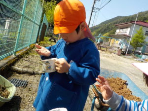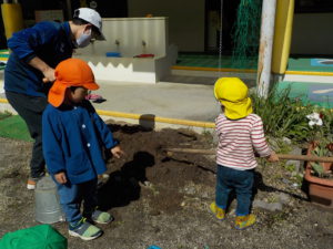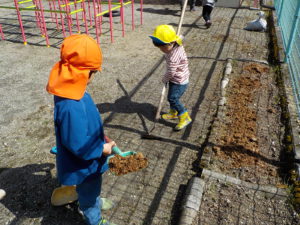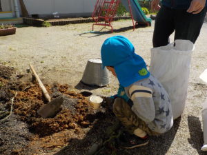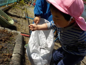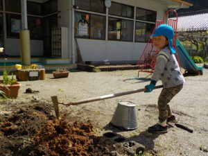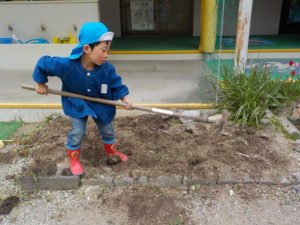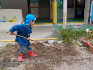 今年度は年長さんが一人だけです。普段から野菜や植物に関心があった年長さんに、今年度は一区画を任せて自分が作りたい野菜を作ることにしました。大好きなおじいちゃんと一緒に畑に行っているので肥料のことも知っています。肥料はお店で買ってくるものと思っていた彼は、「はらぺこくん」の肥料に少々納得いかない様子でしたが、話をして、園の生ゴミからできた肥料を使うことに納得してくれました。「はらぺこくん」のこともエコ活動になります。昨年焼き芋で使った籾殻を燃やしたもの「くん炭」を保存しておいて、今回利用できたことも良い学びになりました。お米は捨てるところは一つもないんですね。職員も勉強になりました。良い野菜を育てるには畑の土がよくなければいけないということは、なんとなくしか話をしてこなかったので、職員も調べながら野菜作りをしていきたいと思います。土は肥料を入れて10日位してから苗を植えるとよいので、今は苗植えの日を楽しみにしています。小さいお友だちも植えるので、年長さんがみんなに野菜の上手な作り方を教えてあげるのもいいなあ、と思っています。