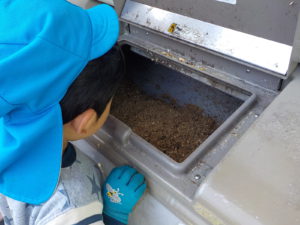 そして土作りの日。はらぺこくん(生ゴミを肥料に変えてくれる処理機)から肥料を取り出します。