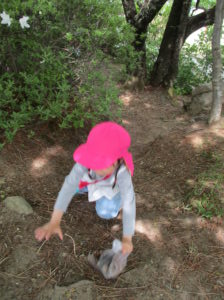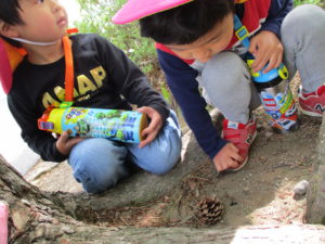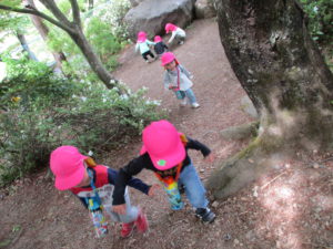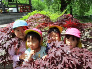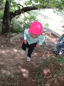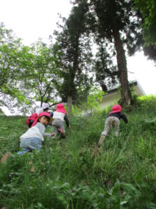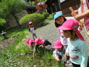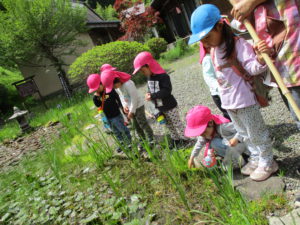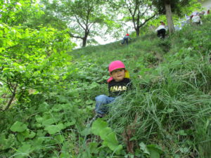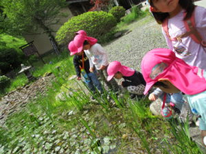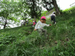・残念ながらカエルには会えなかったけれど、たくさんのフィールドの中で五感を働かせ、思いきり自然を満喫している子どもたち。いろいろな発見に共感したり「こんなこともできるよ!」と伝えたり、まずは保育士が豊かな感性を磨かなければと思っています。