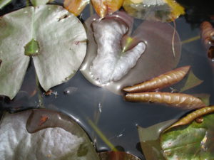 ・「しーだよ!そうしないとオタマジャクシ足音や声で葉っぱの中に隠れちゃうんだ」