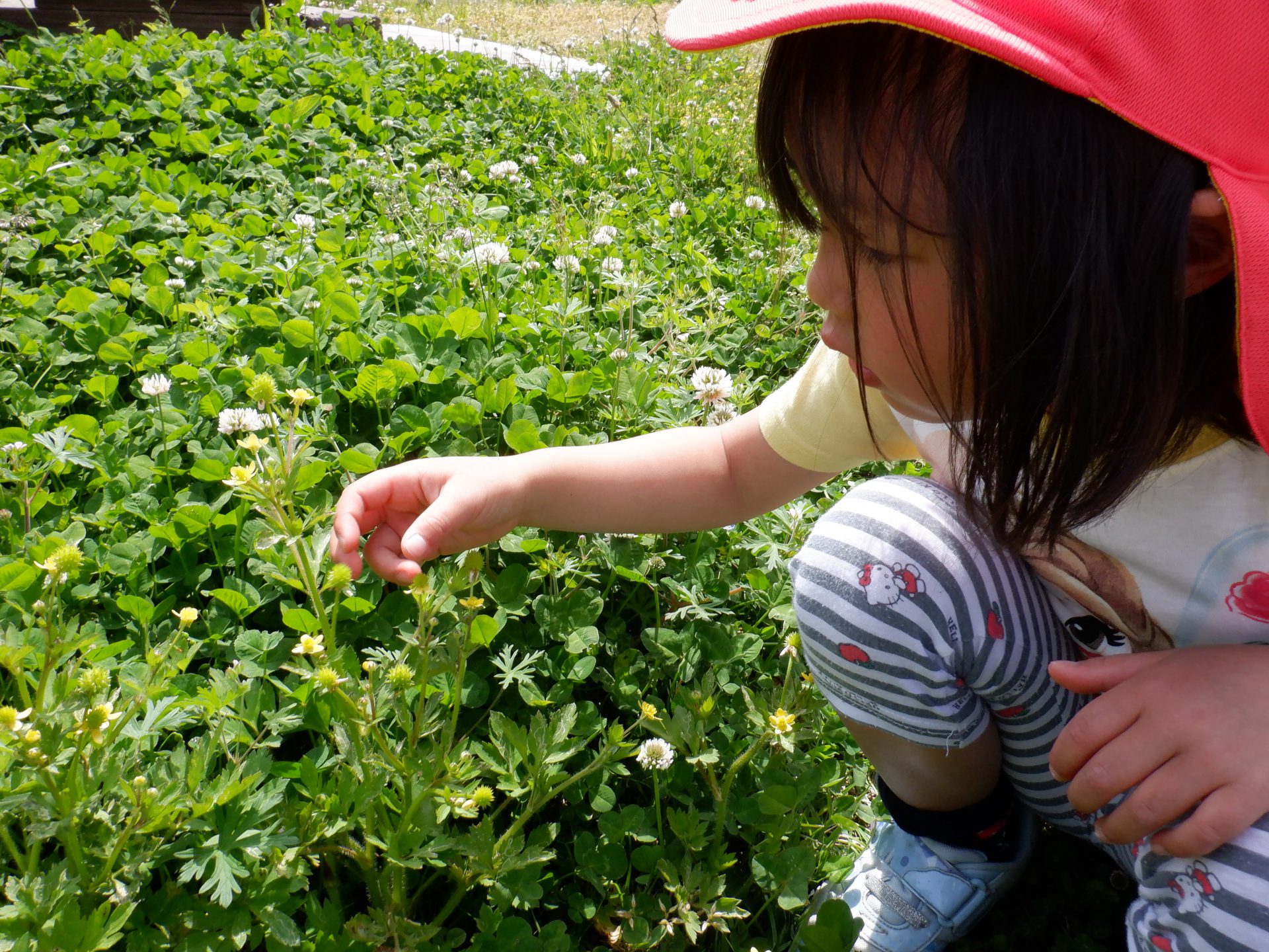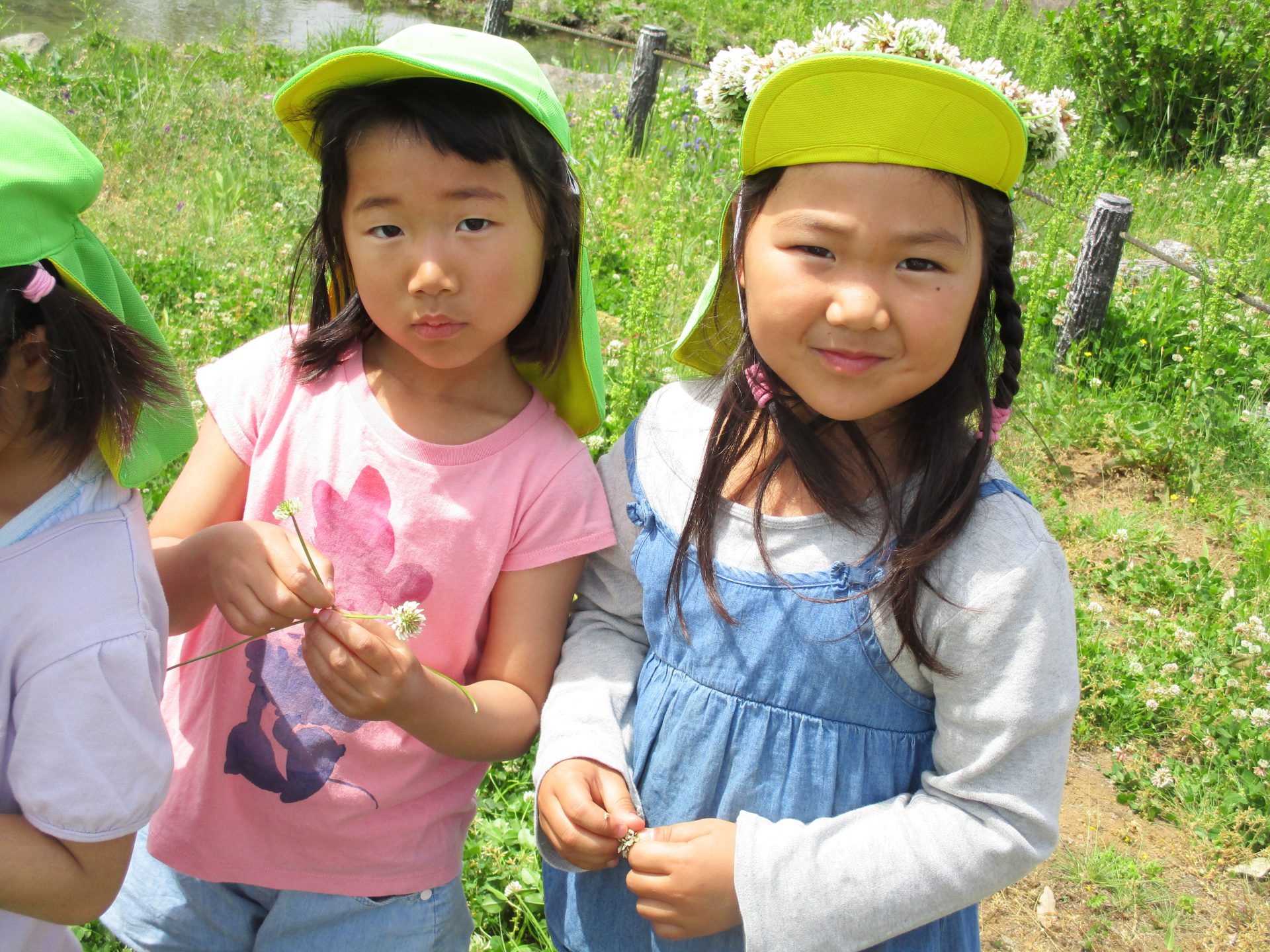 女の子たちは野原でシロツメクサの冠作りにチャレンジ!