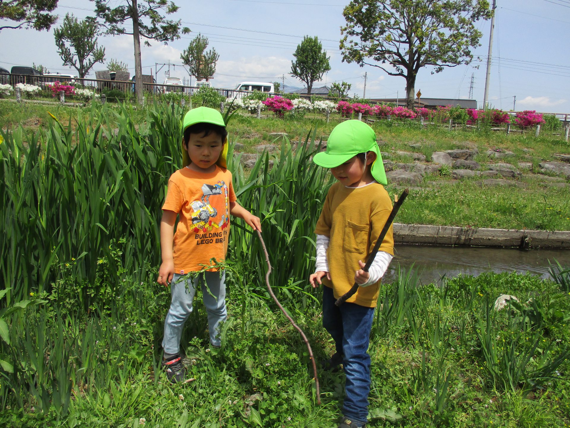「よーいドン!」と小川に流し競争です。