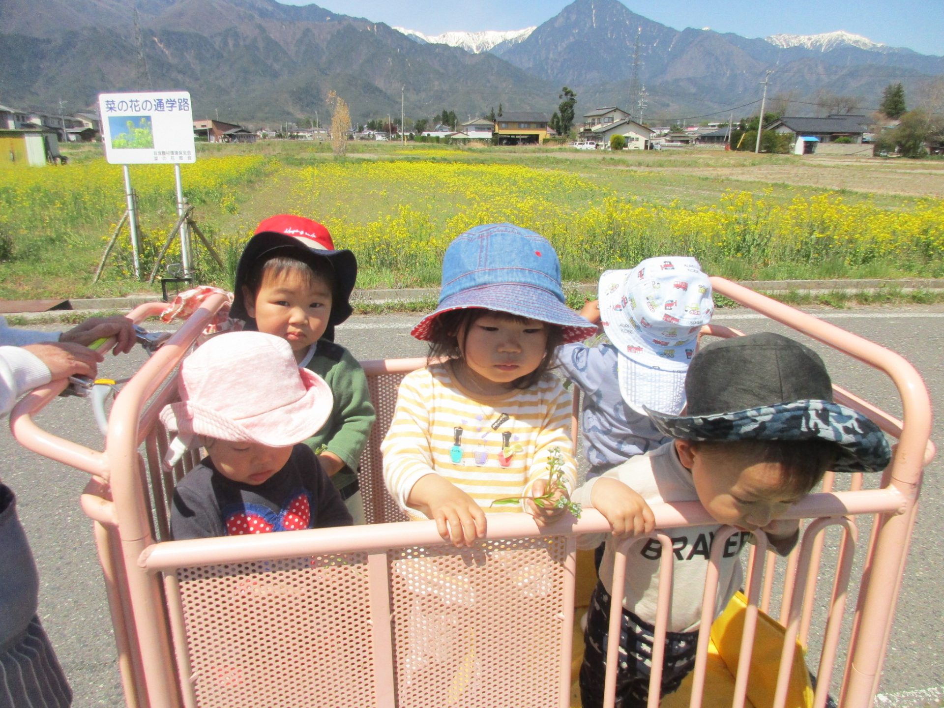 菜の花に目を向けると、チョウチョを発見。「きいろ…」チョウチョの色をつぶやく子どもたち。