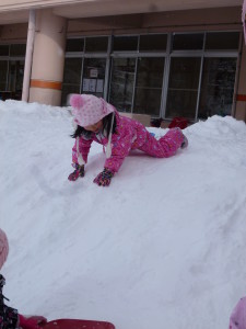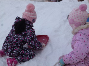 始めはただひたすらソリに乗って滑ることを楽しんでいましたが、そのうち滑ることを止めてなにやらせっせと雪を土手に運ぶ姿に変わりました。