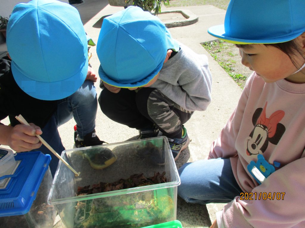 少しお腹が膨らんできたチョウロちゃんを観察し、また小さなカナヘビの赤ちゃんに会えるのを楽しみにしている、ぶどうぐみの子どもたちです。