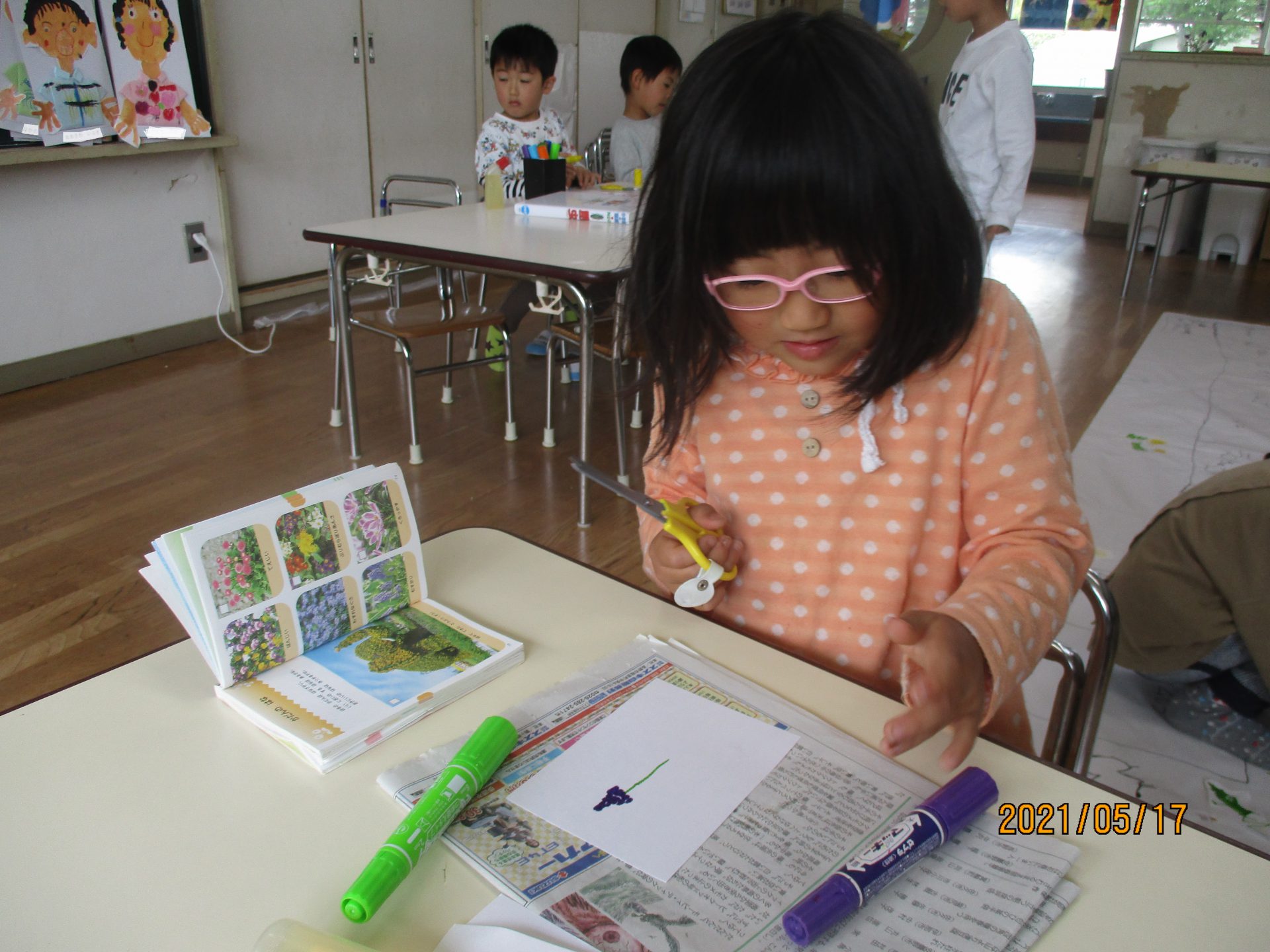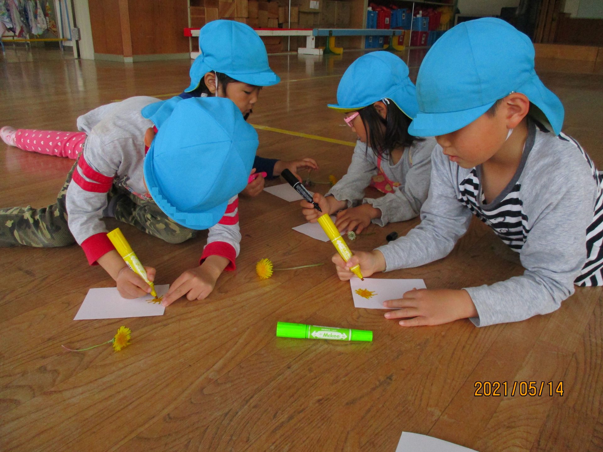 友だちと見せ合って…「この花どこに咲いていたの?」「何て言う名前??」「葉っぱも取ってきて描いたらいいんじゃない?」どんどん会話や想像が膨らみます。