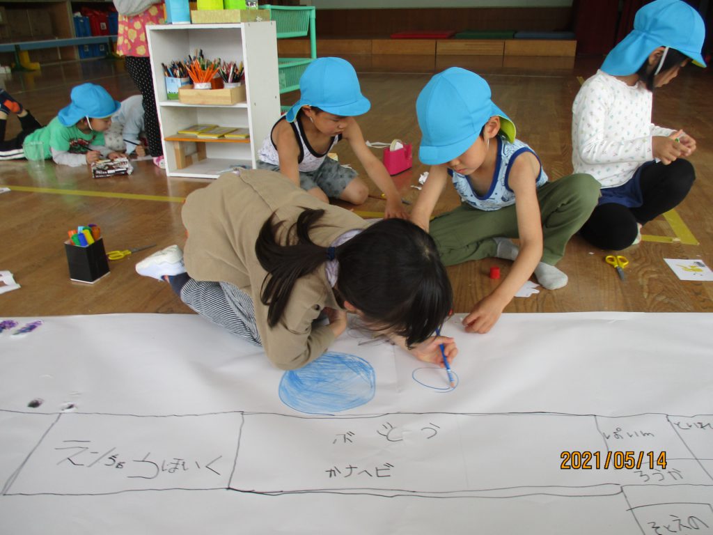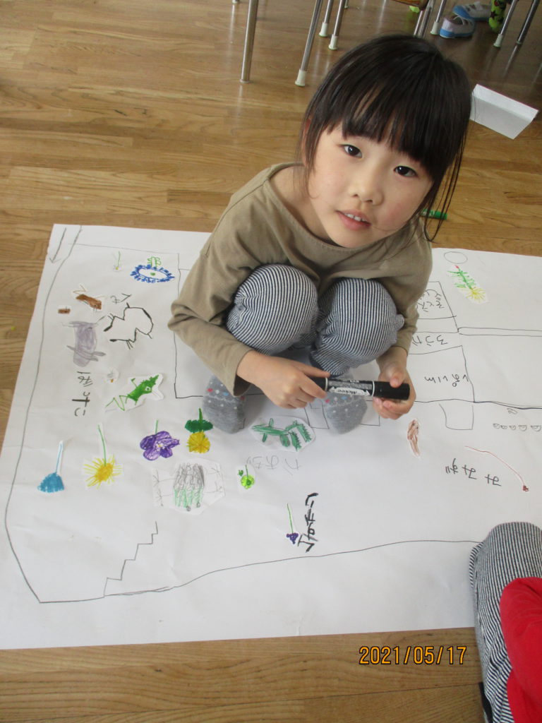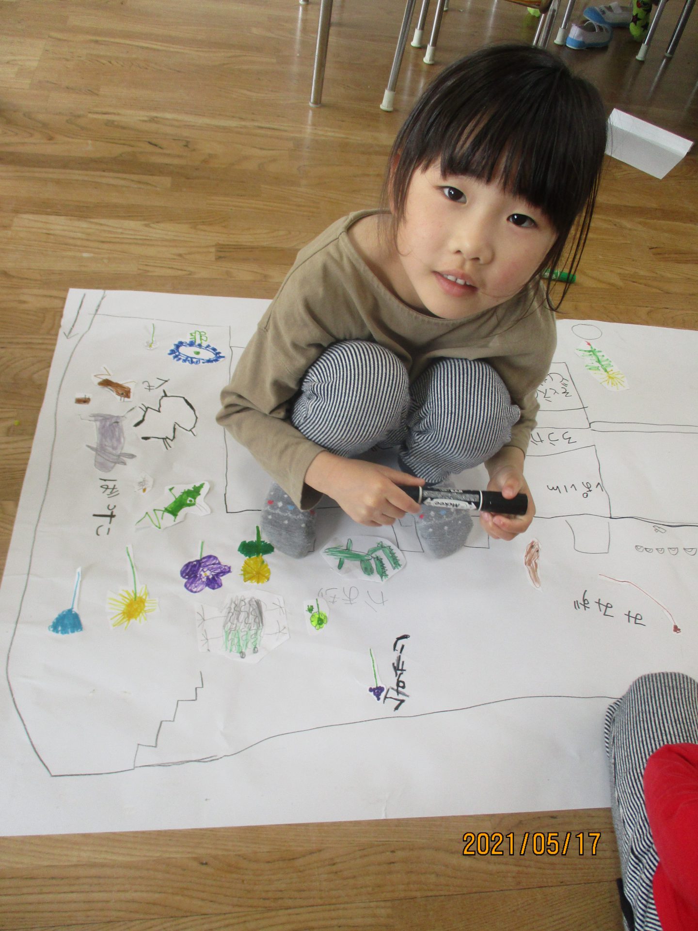 そこから、「わくわく広場の地図作ろうよ」「そうだね、小さい子が見ても分かるといいね!」と植物や生き物を調べたり描いたりして地図作りが始まりました。