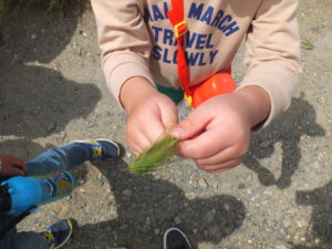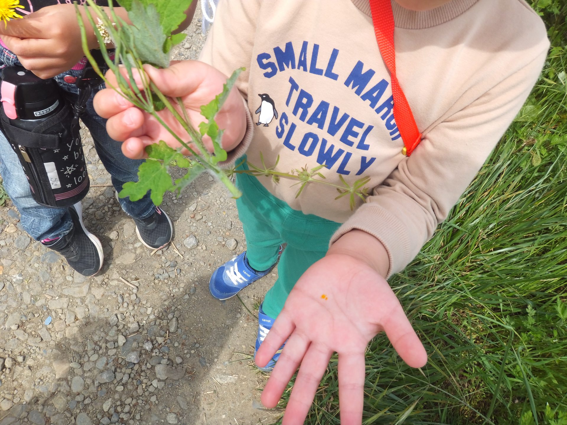 「これ、くっつくんだよ。」「この草、さわるとペタペタしてるの。」