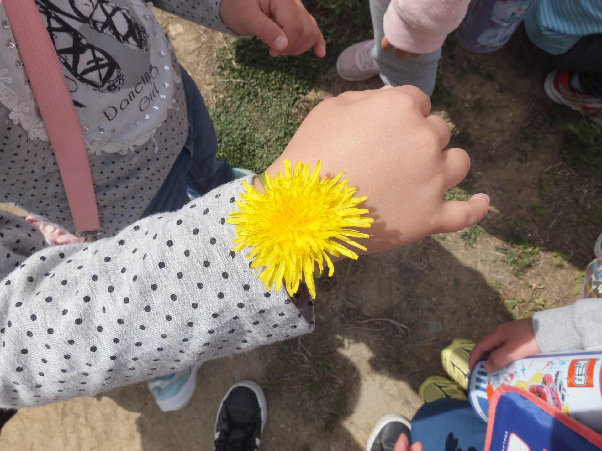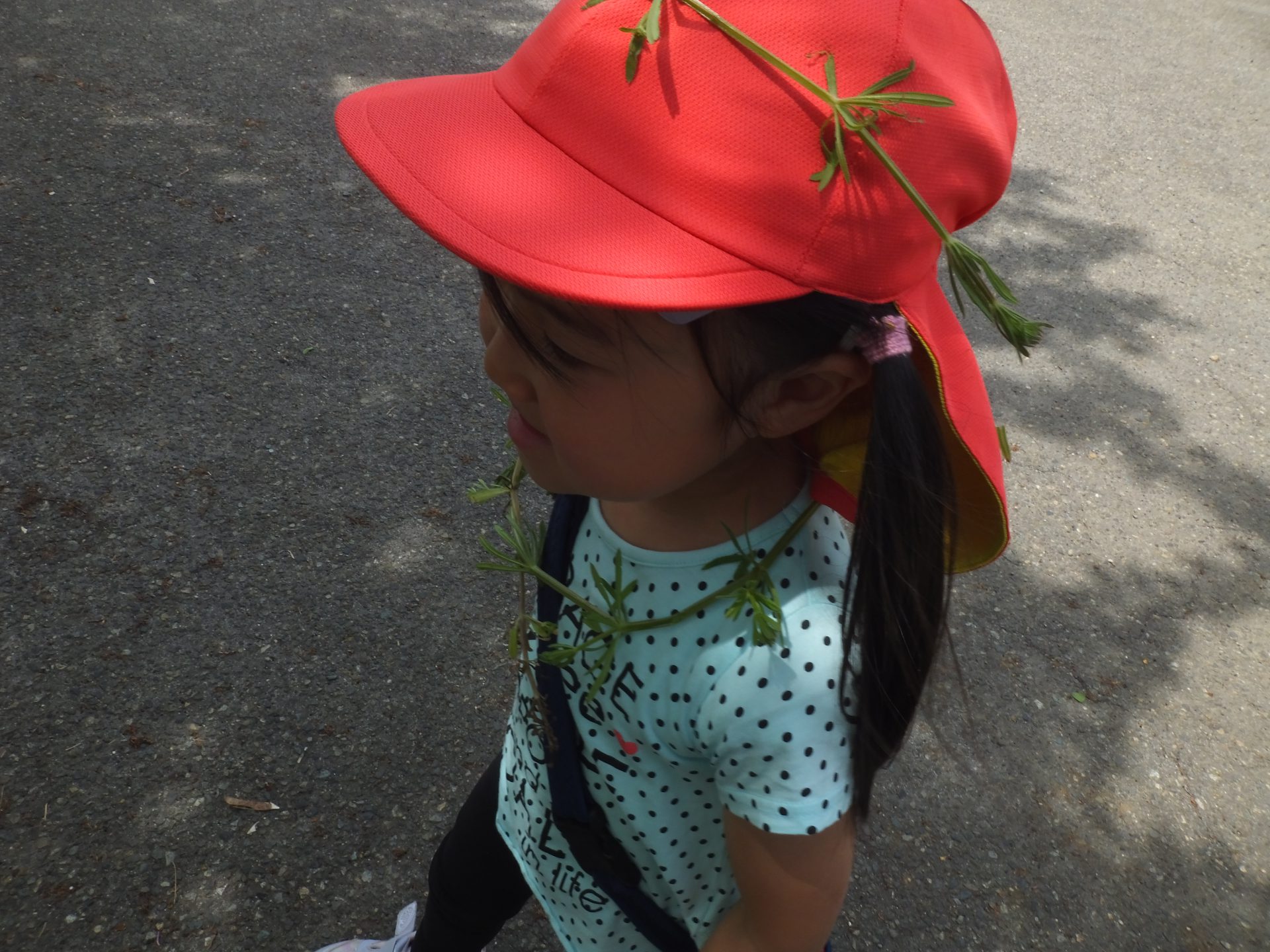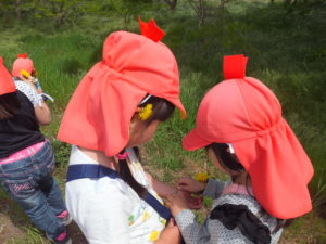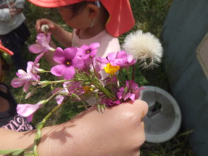 たくさんの自然物に囲まれて、自ら草花で身の回りを飾り、友達とおしゃれごっこやテレビで人気の鬼ごっこを楽しむ子ども達に感心しました。