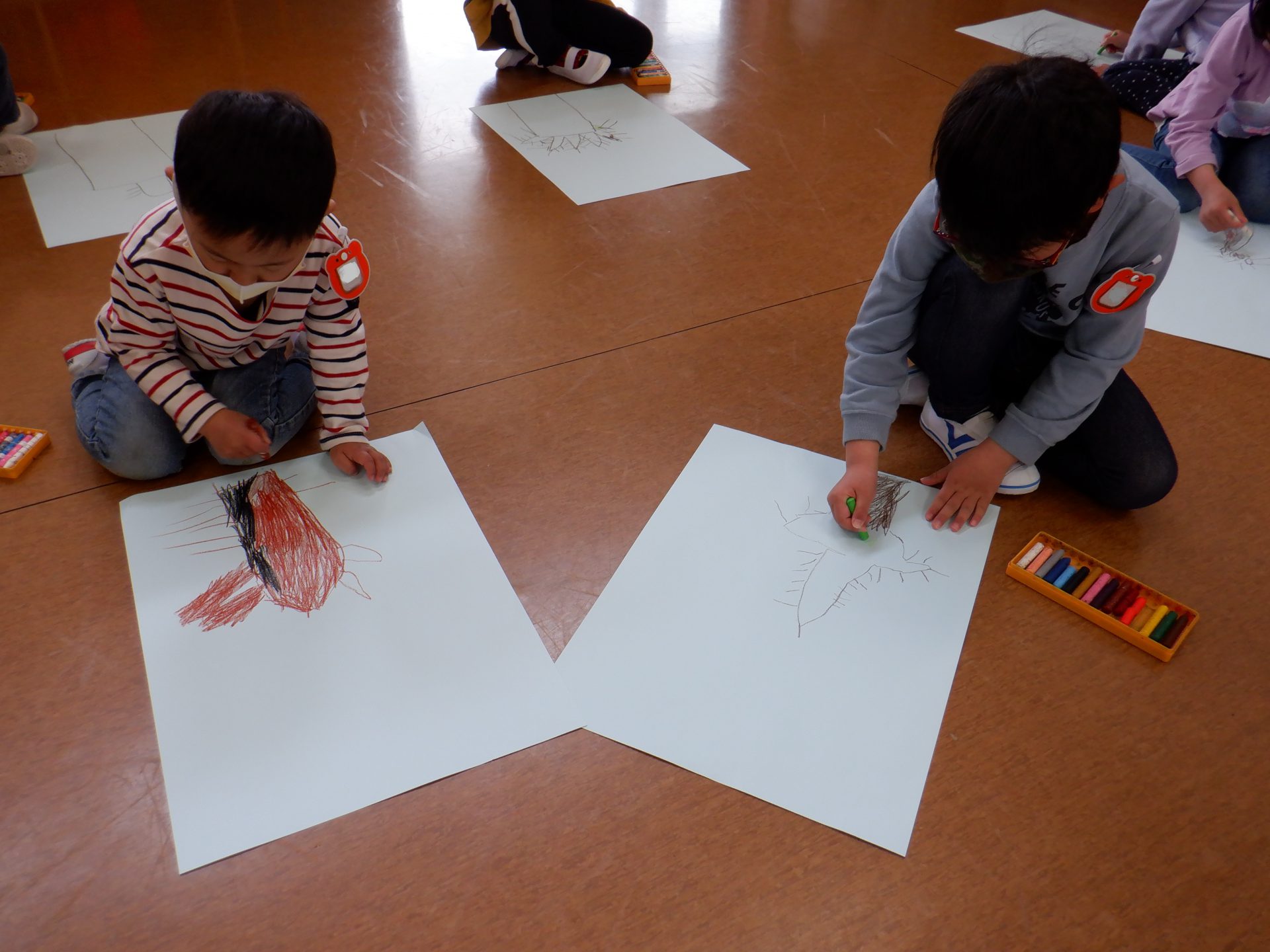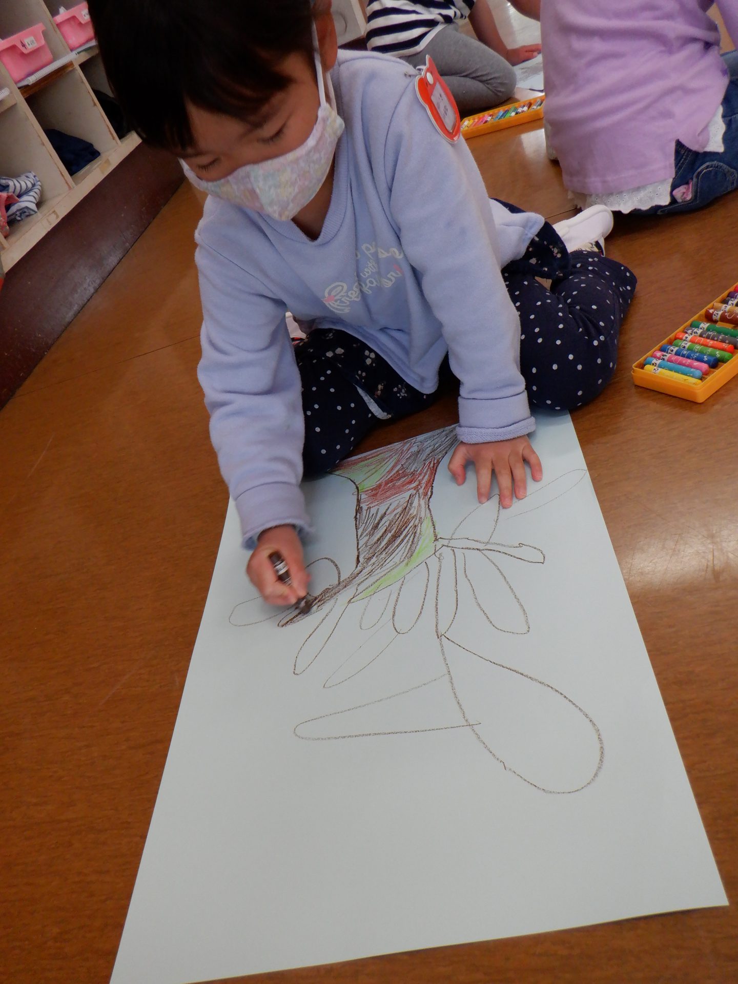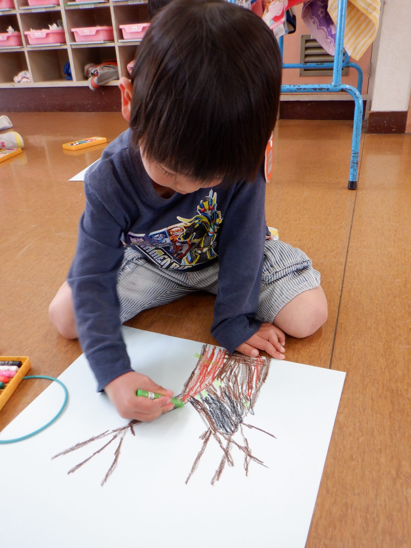 黒のクレヨンを作ったり、黄緑を使ったり、目で撮ってきた桜の木が再現、真剣!!