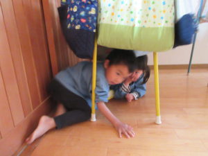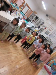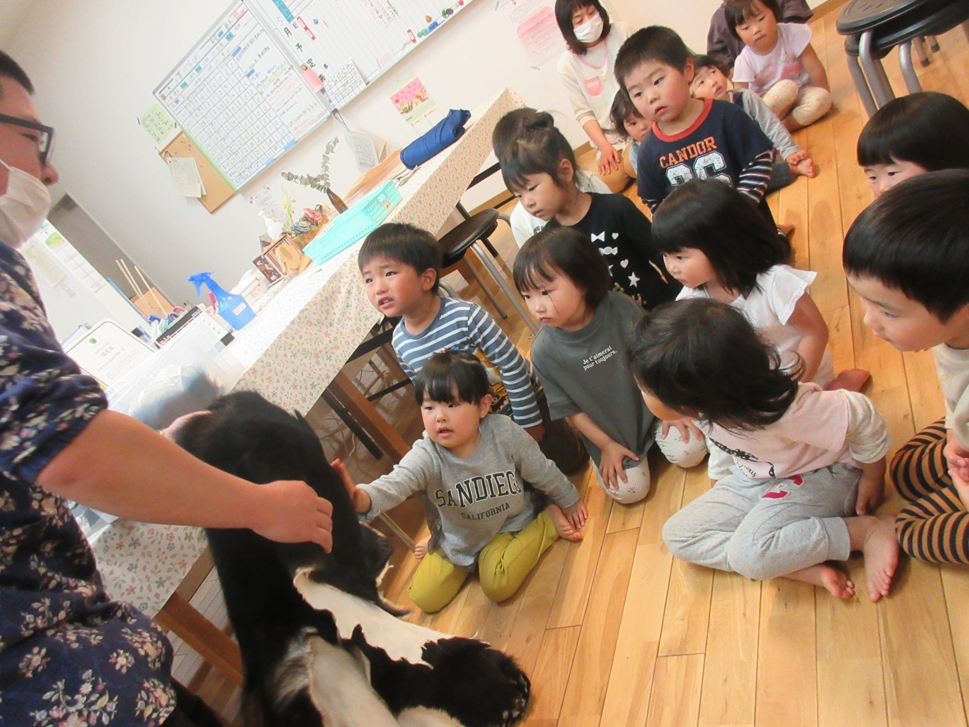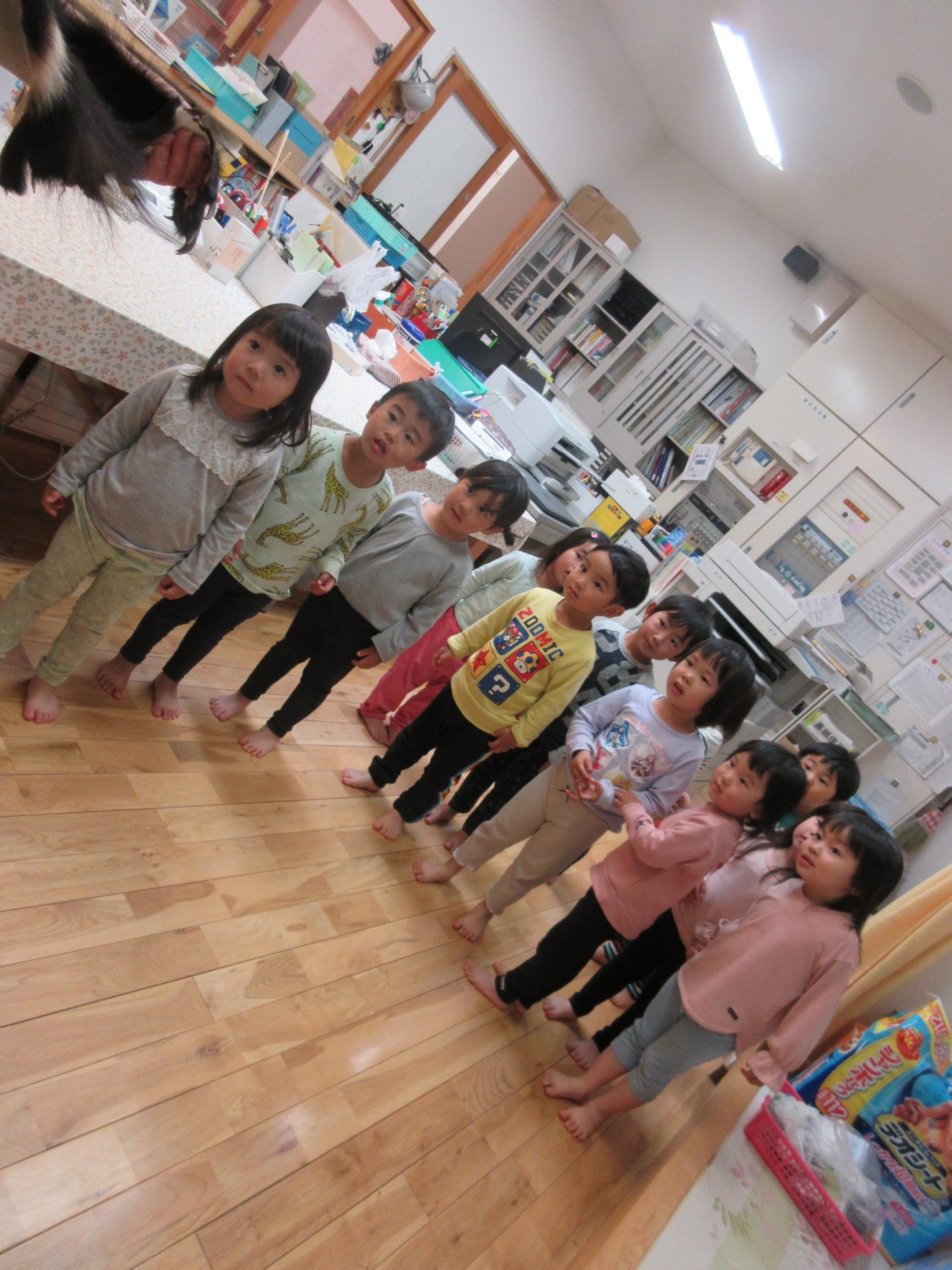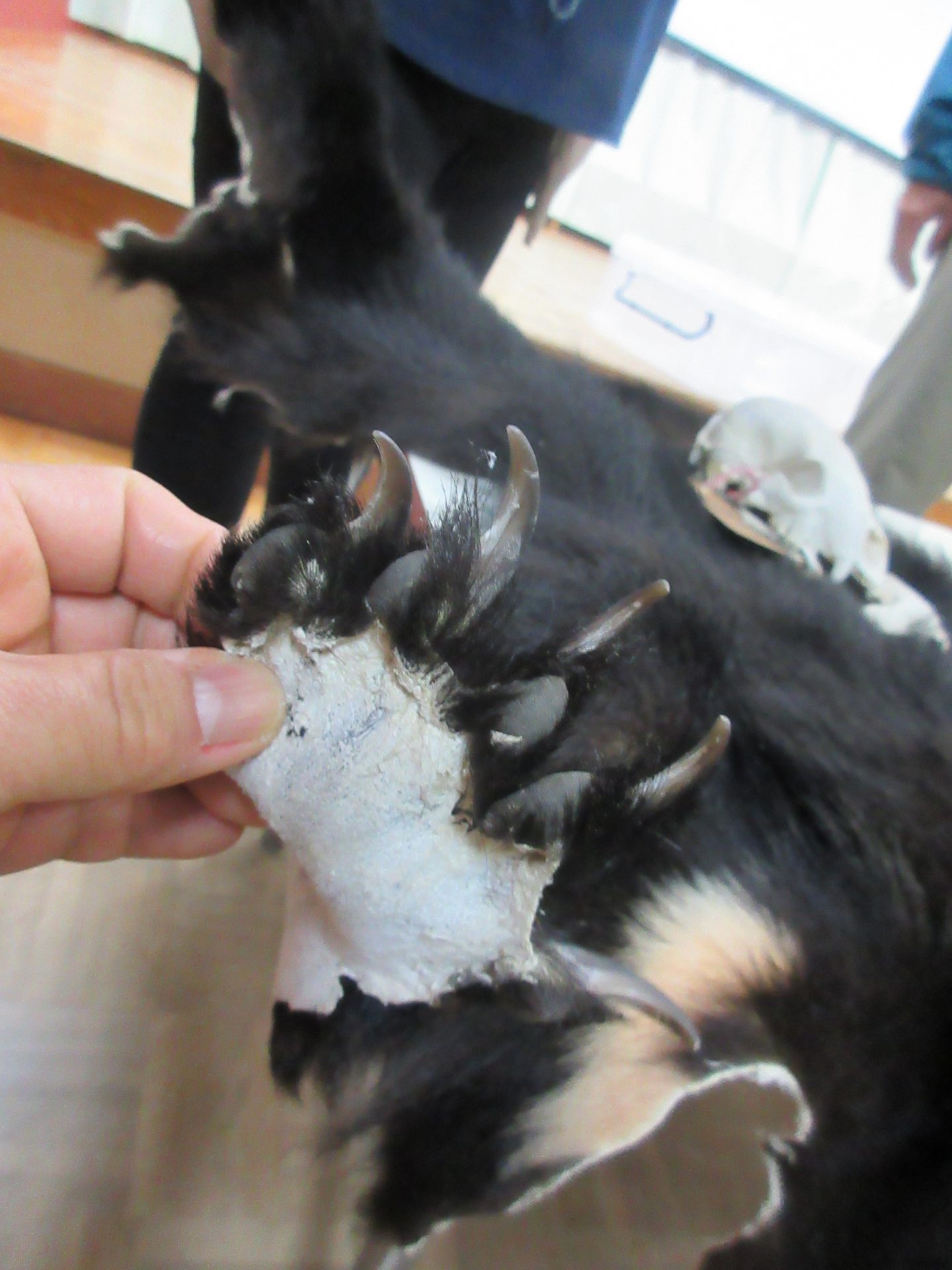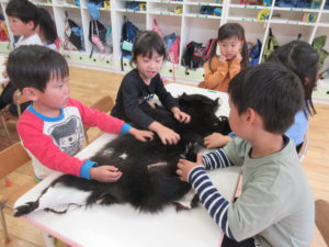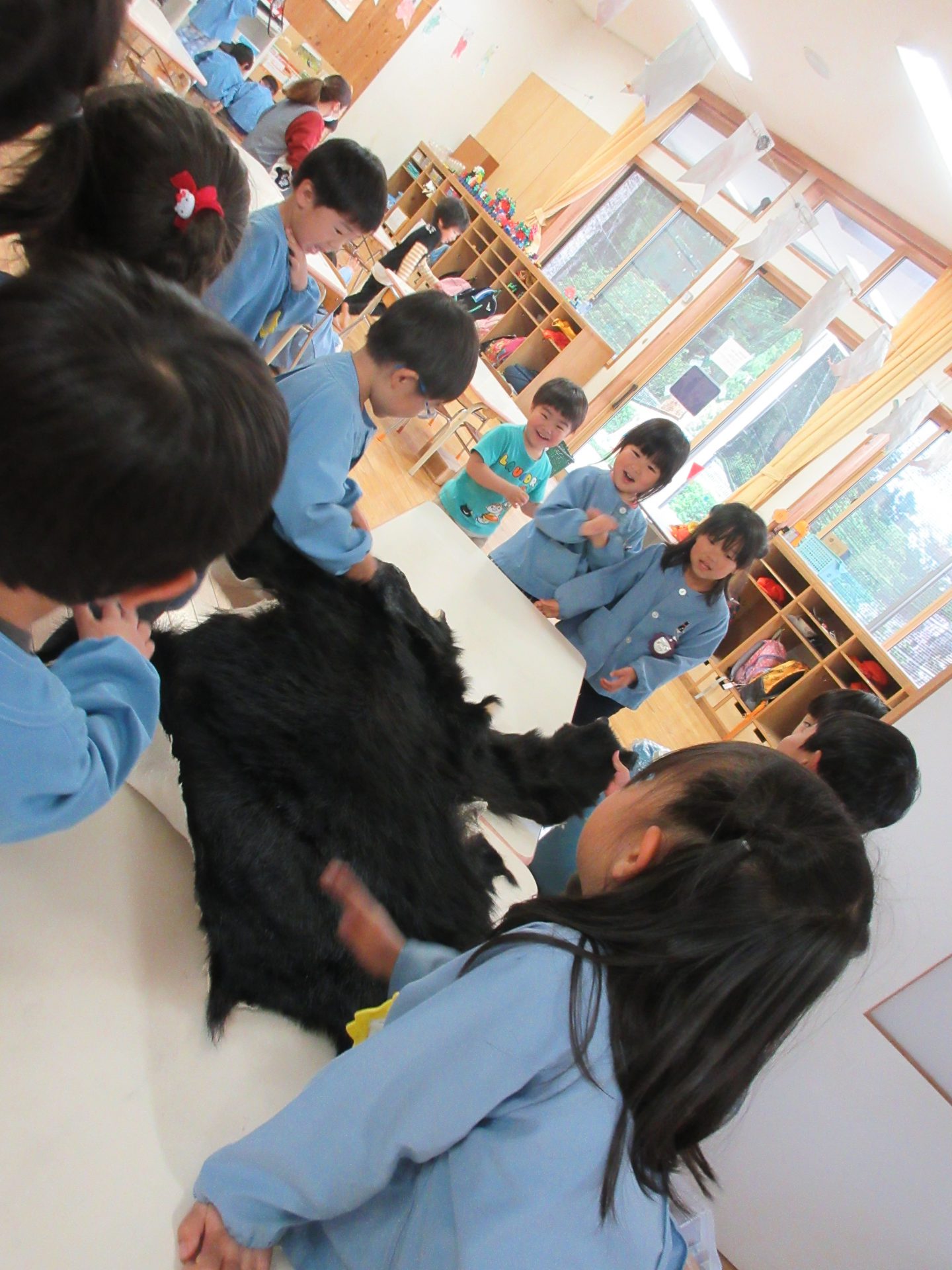 僕も椅子の影に隠れていたんだけど、クマさん動かないよって先生がいうから触ってみたよ 。 「クマのいる森は自然が豊かな森だ」ということを講師の先生に教わりました。 本来、クマは臆病で、人間を襲ってしまう事案は「クマが自分を守ろうとする」からなのだと。 森に入る時は人間の存在を知らせるよう、鈴等を鳴らしながら入ることや、森にはいろいろな生き物がすんでいるという事を改めて意識する事の大切さ。 人間の生活の変化に伴い、森が荒れて藪が増えたり、家庭のごみを山に捨てたり、野ざらしにしたり… 。自分達に出来る事をしながら、共存したいなと思います。 普段、鉄砲ごっこを楽しんでいる子が、友だちが鉄砲ごっこをし始めたら泣き出したそうです。今回クマの毛皮を見て、鉄砲で打つと死んでしまうんだという事を肌で感じたようです。また年長さんからは「かわいそう」という言葉も でてきました。毎年クマが里におりてくるこの地区。正しい知識を持ちながら共に豊かな里山を楽しみたいです。