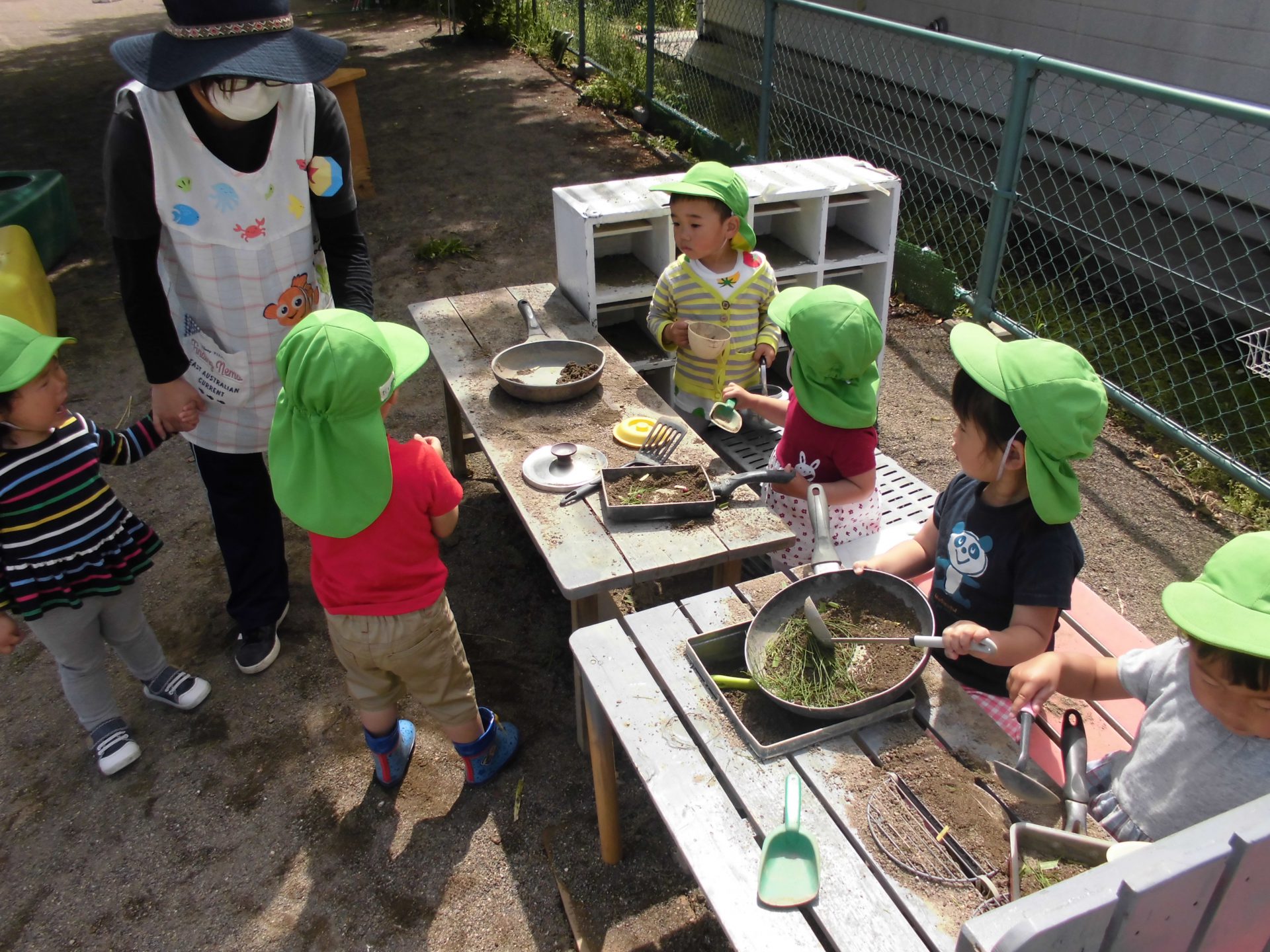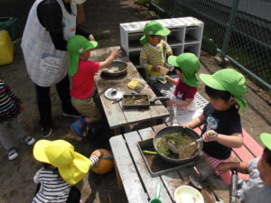 不要なフライパンに、具材(土・草・花・実)を入れて、かわいい手つきで炒めます。