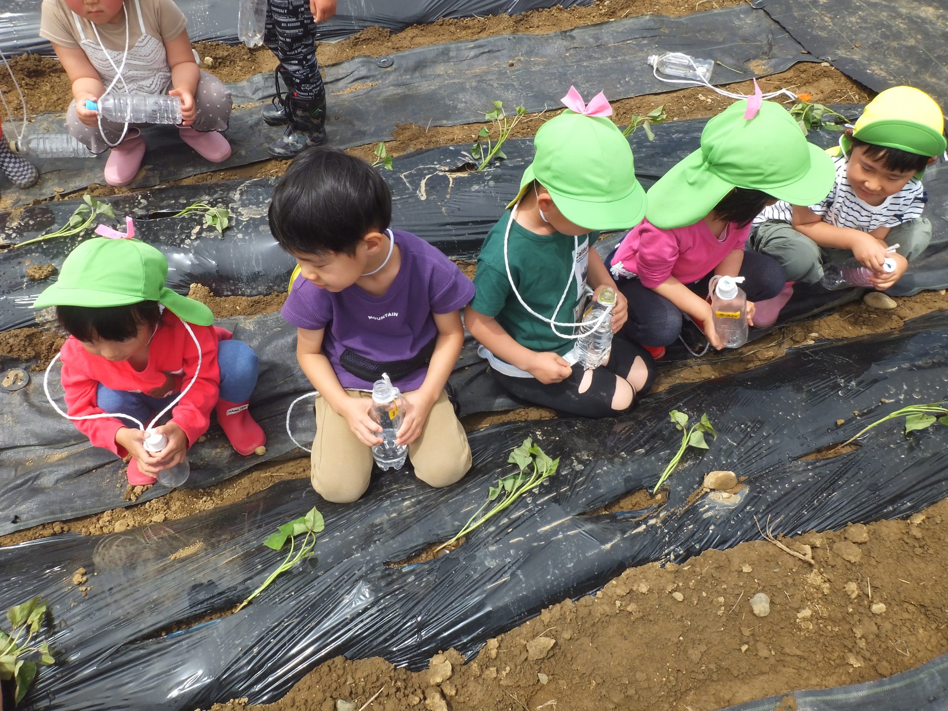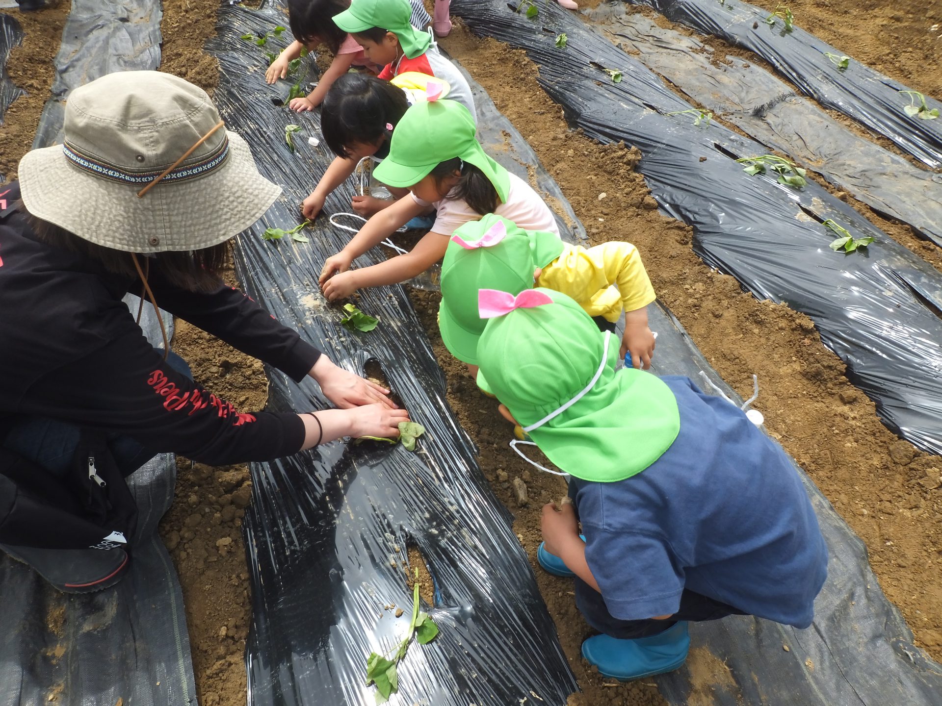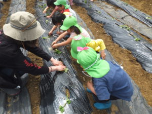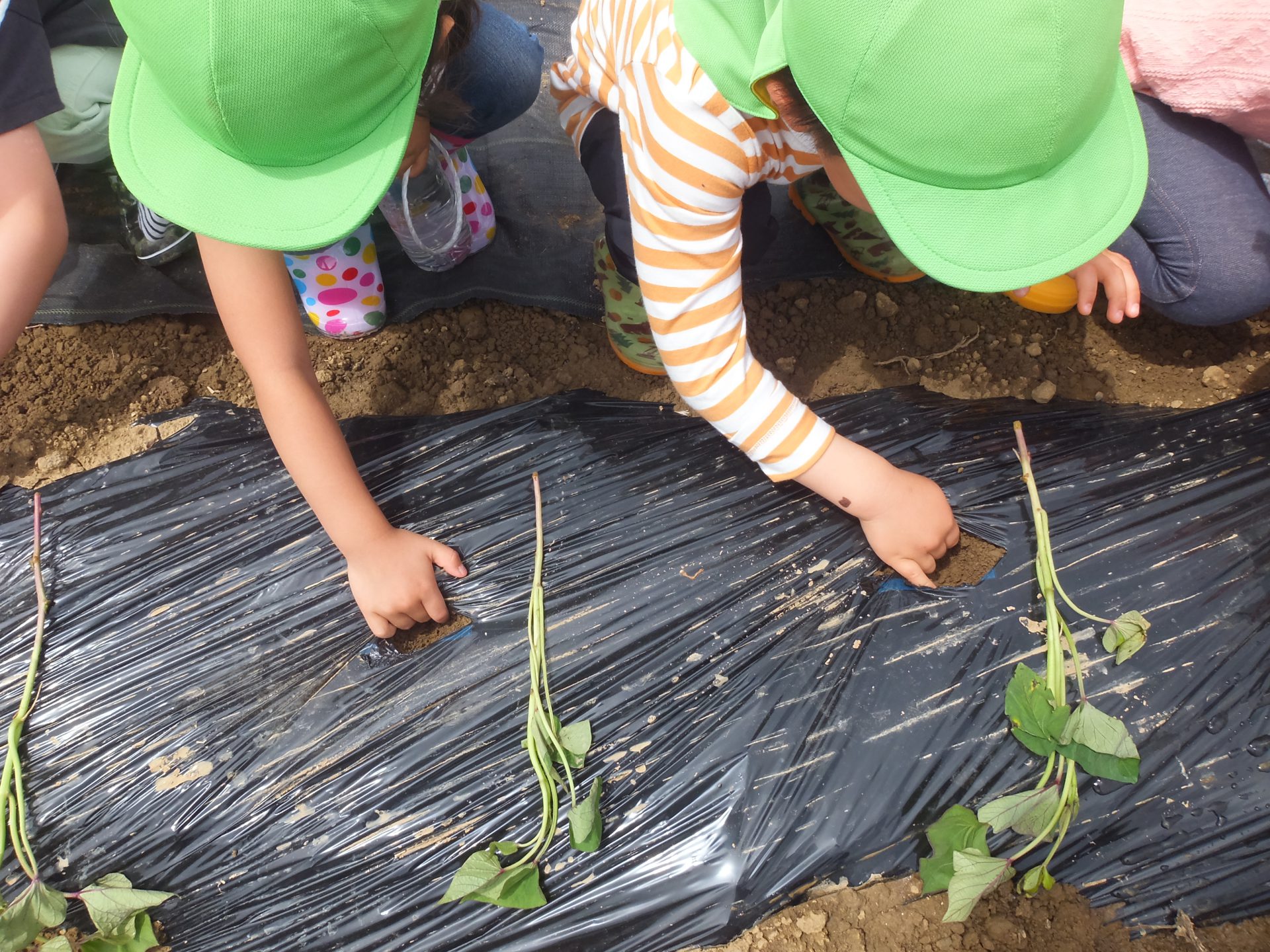 「おいもの苗をねんねさせて植えてね。」と保育士。