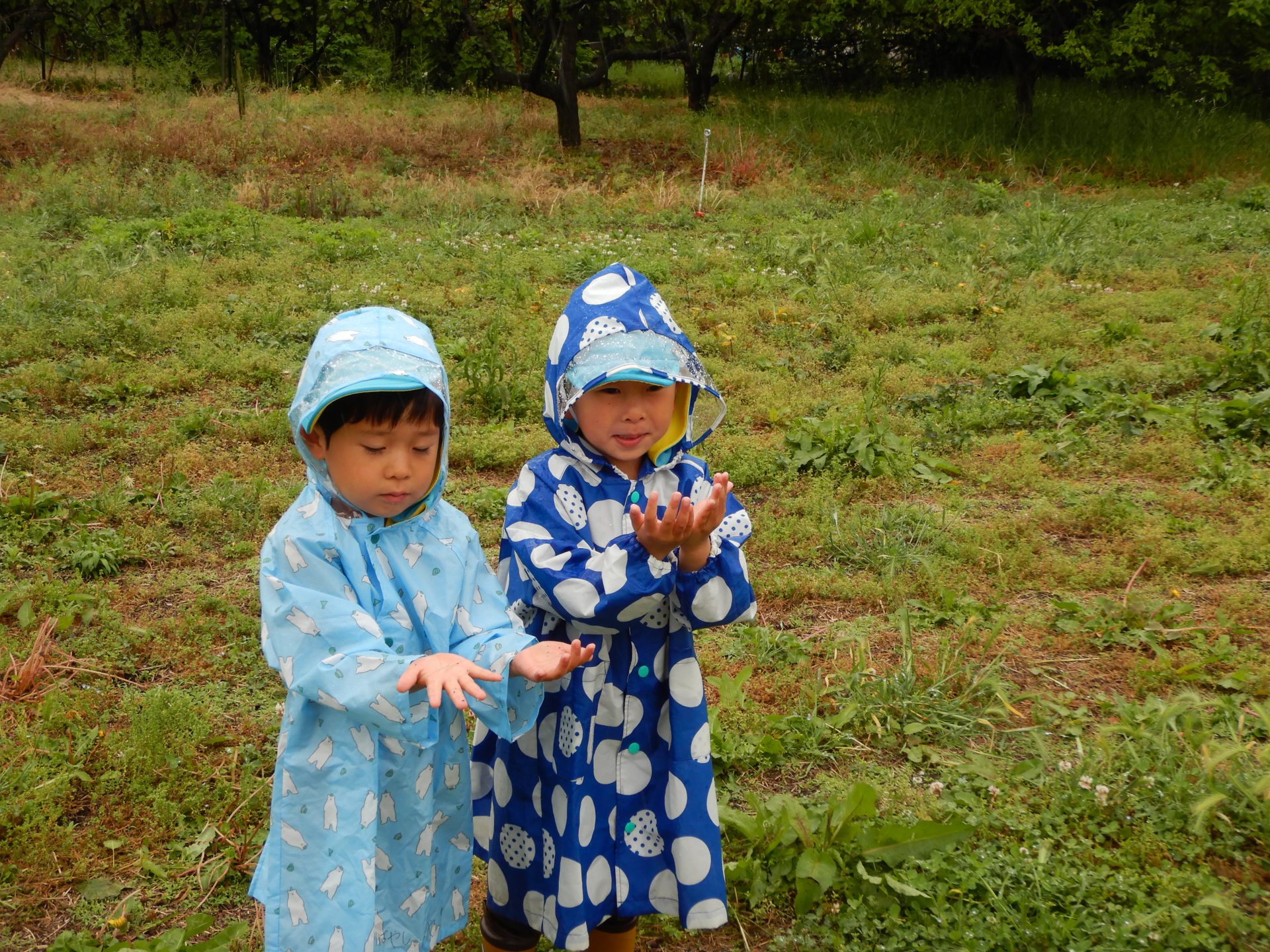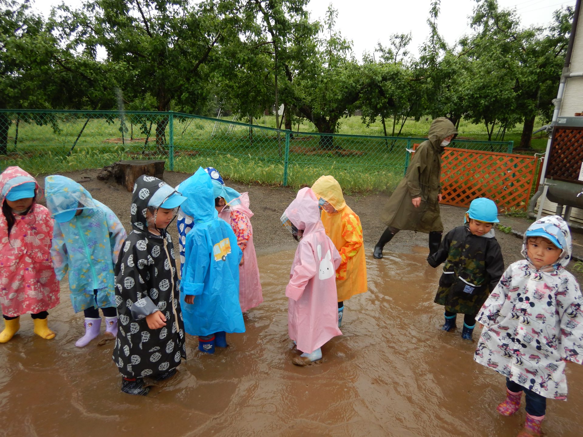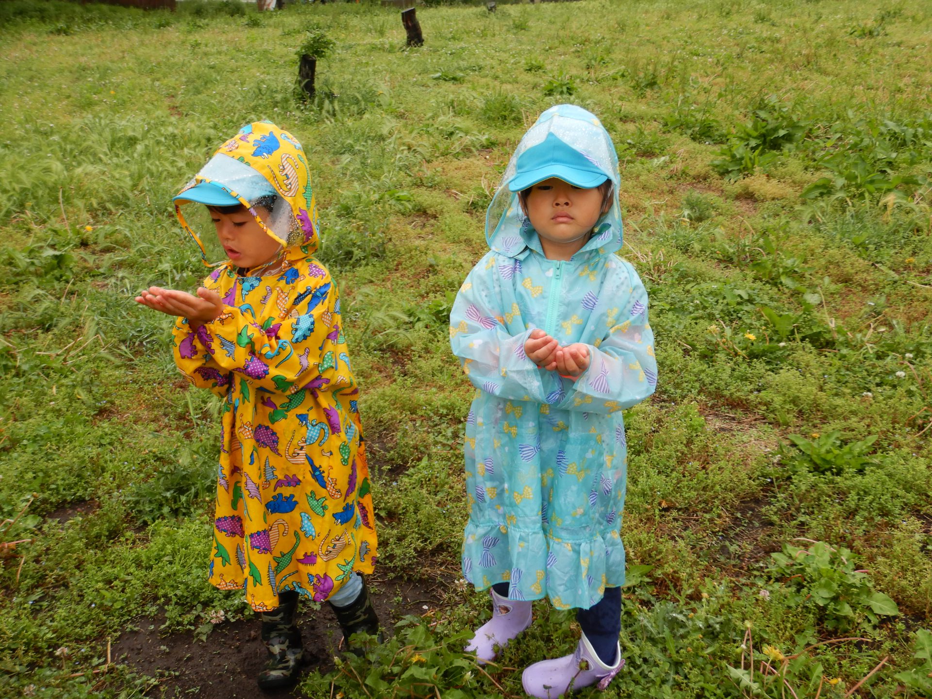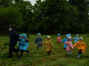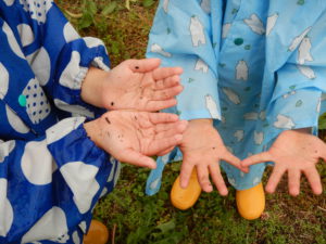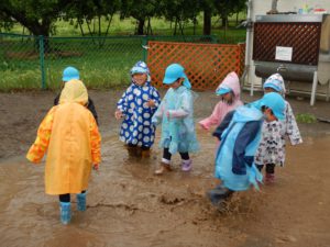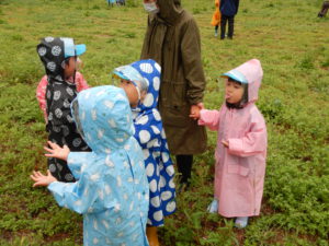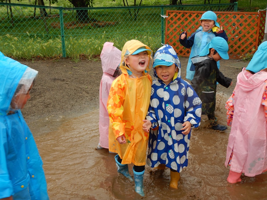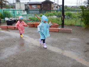 この日は本当は遠足の日。あいにく雨降りになってしまいましたが雨の中で思う存分、遊べ子どもたちはとても楽しそうでした。また雨の中の発見を楽しんでいきたいと思います。
