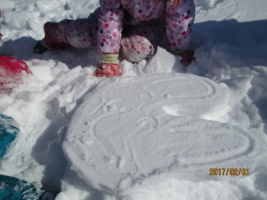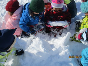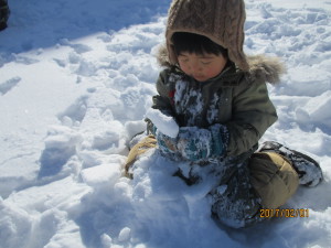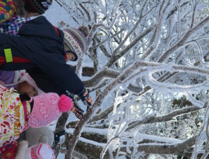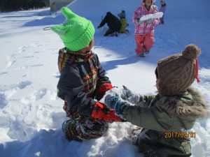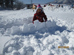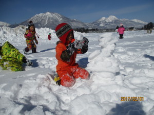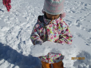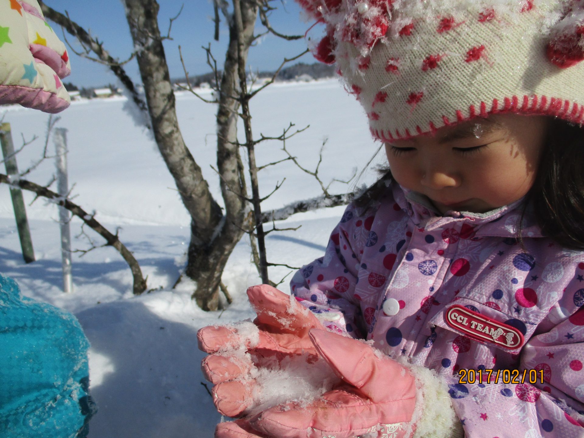 小さいお友達には、大きいお友達が雪をプレゼント。