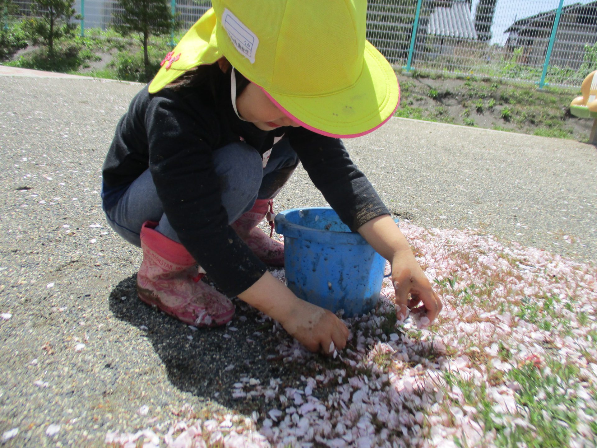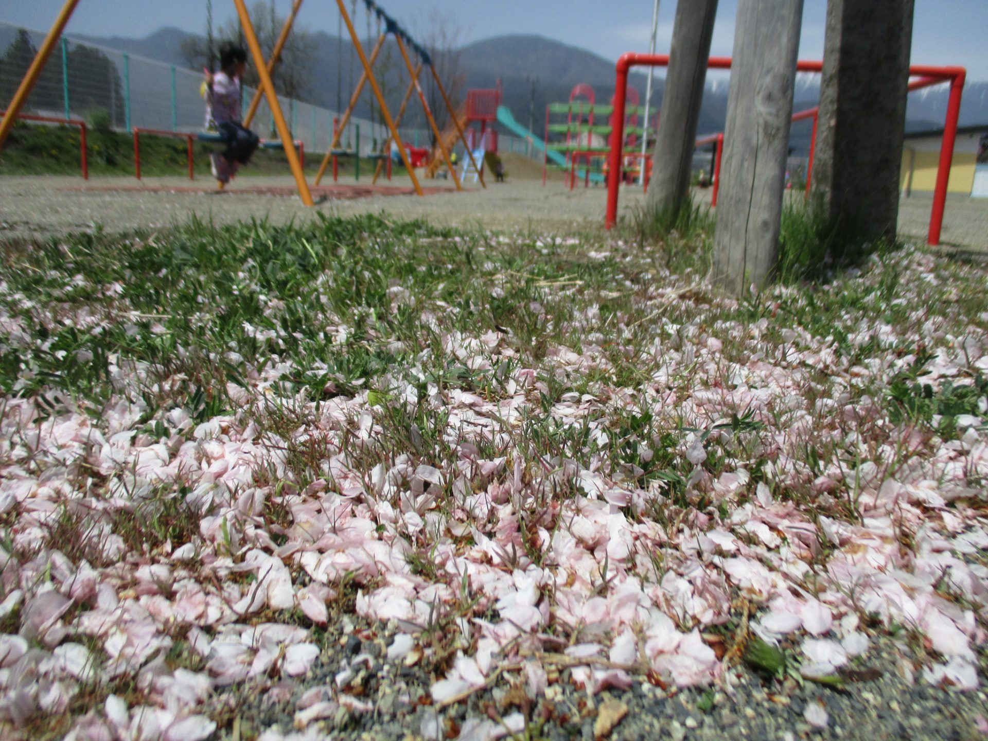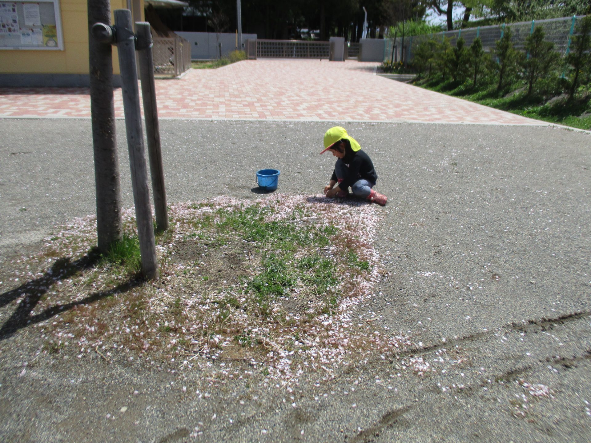 園舎の隣の木から桜の花びらが風に吹かれてやってきました。