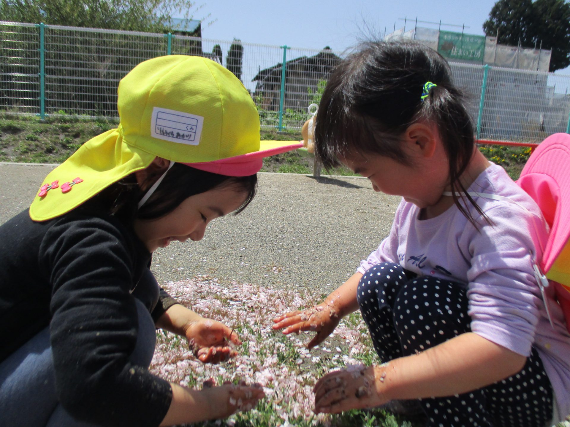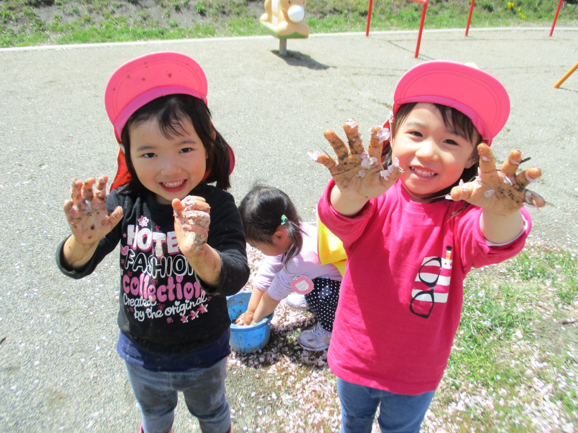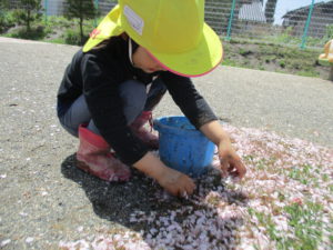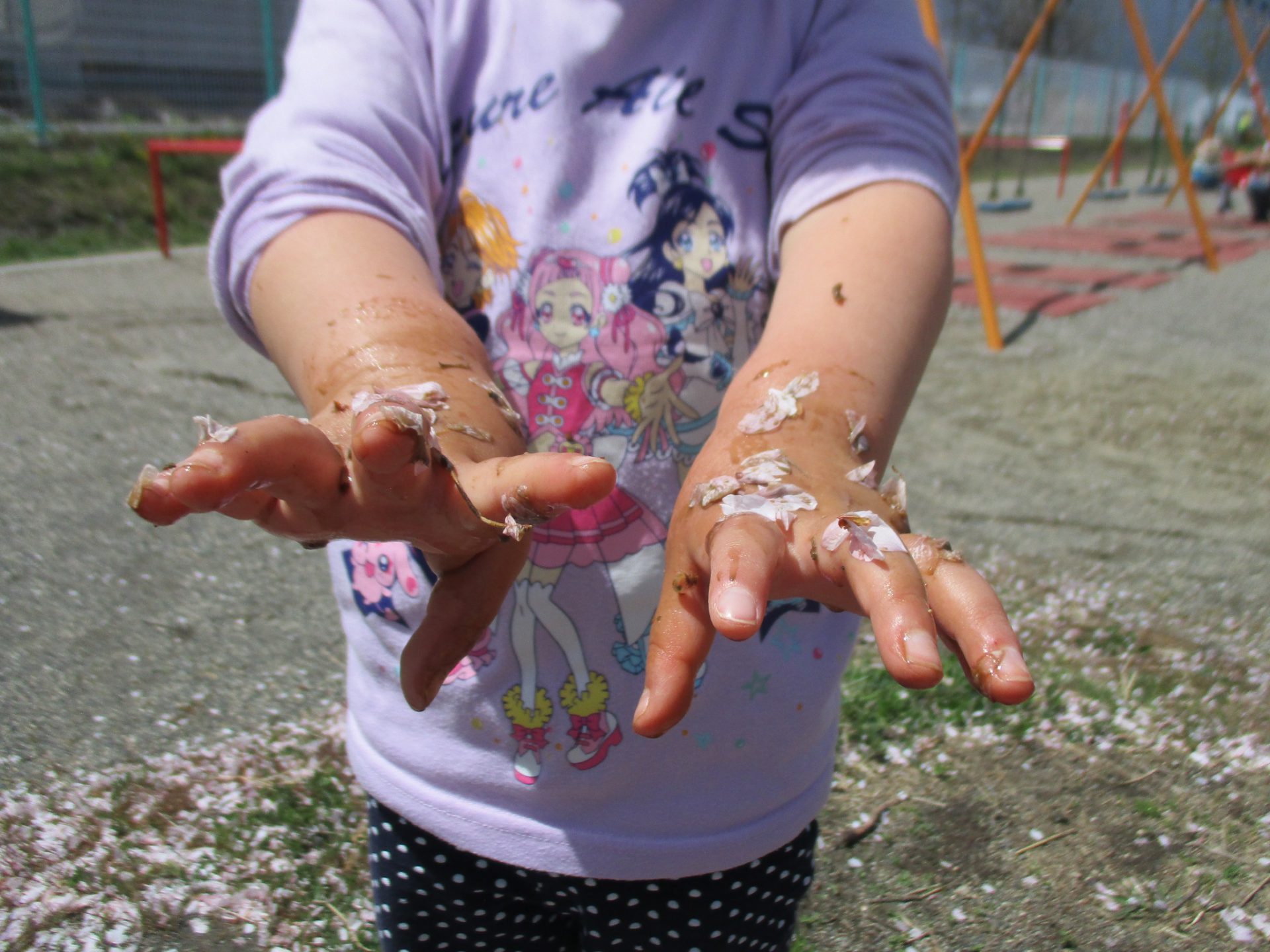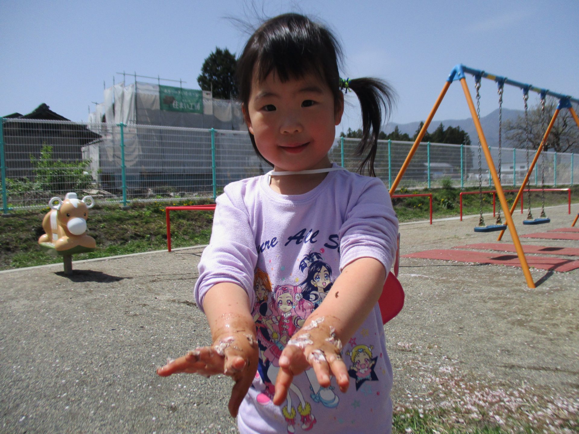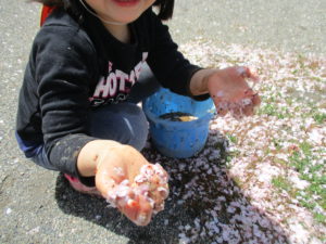 ぬれた手に桜の花びらがくっつく事に気がついた女の子。