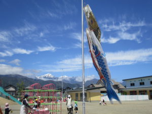 風の強いある日、子どもたちは青空の下、元気に園庭へ出かけていきます。