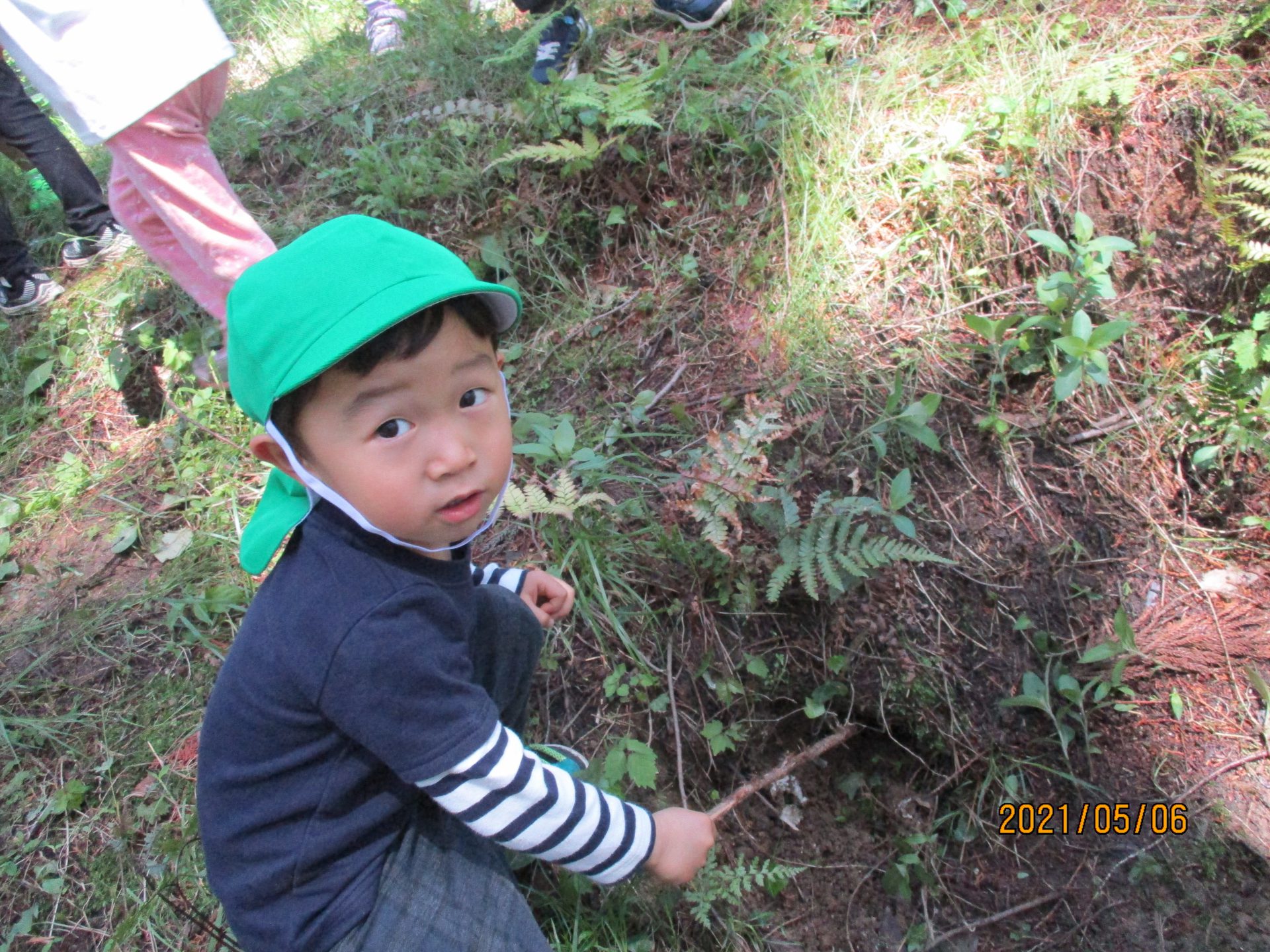 ・前日に出かけたときにたくさん穴が空いているのも見つけた子ども達、棒でつついては「何が住んでいるんだろう?」