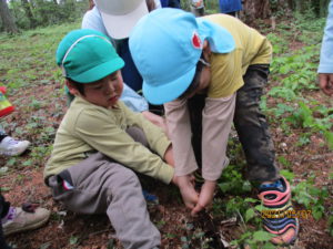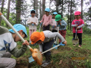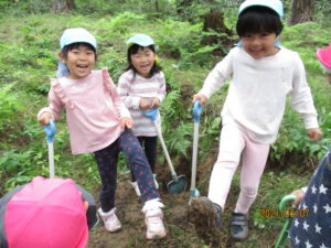 「もぐらだったりして・・・。」「ヘビ?ゴリラ?・・・」と想像してわくわく。「スコップを持っていこう!」と