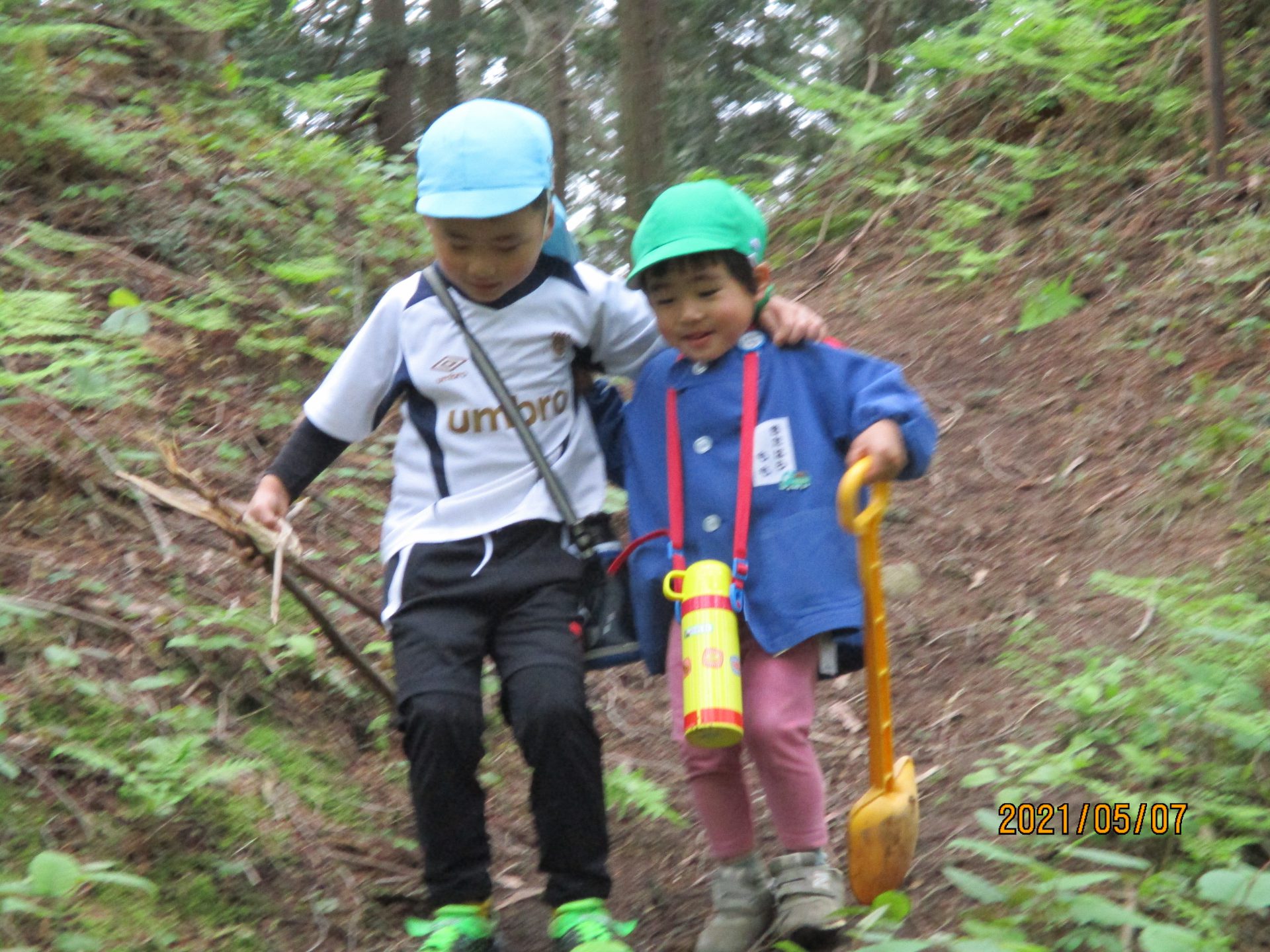 帰り道は急な下り坂、年少の女の子が「すべっちゃう~。」と困っているとすかさず戻って肩を組み、