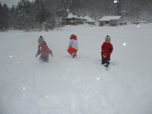 雪が積もった今日は、園庭を飛び出しお隣の畑へ。