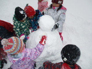 力を合わせて、雪だるま作り。