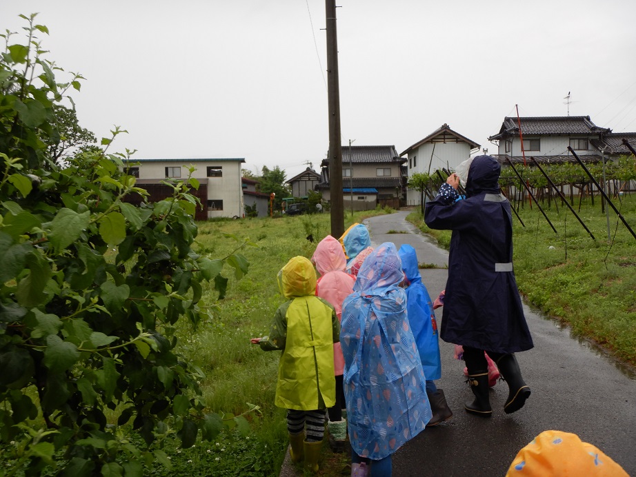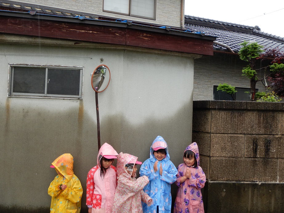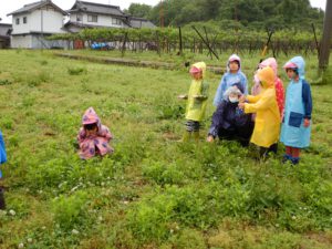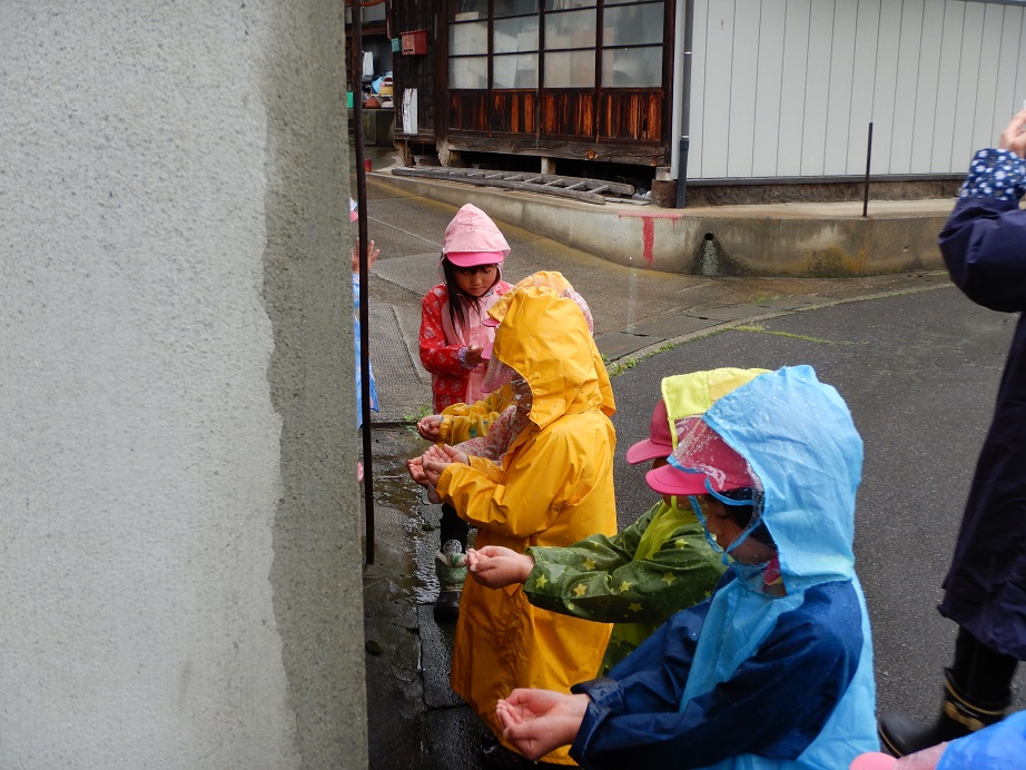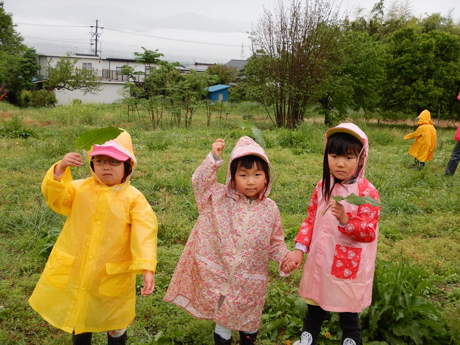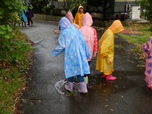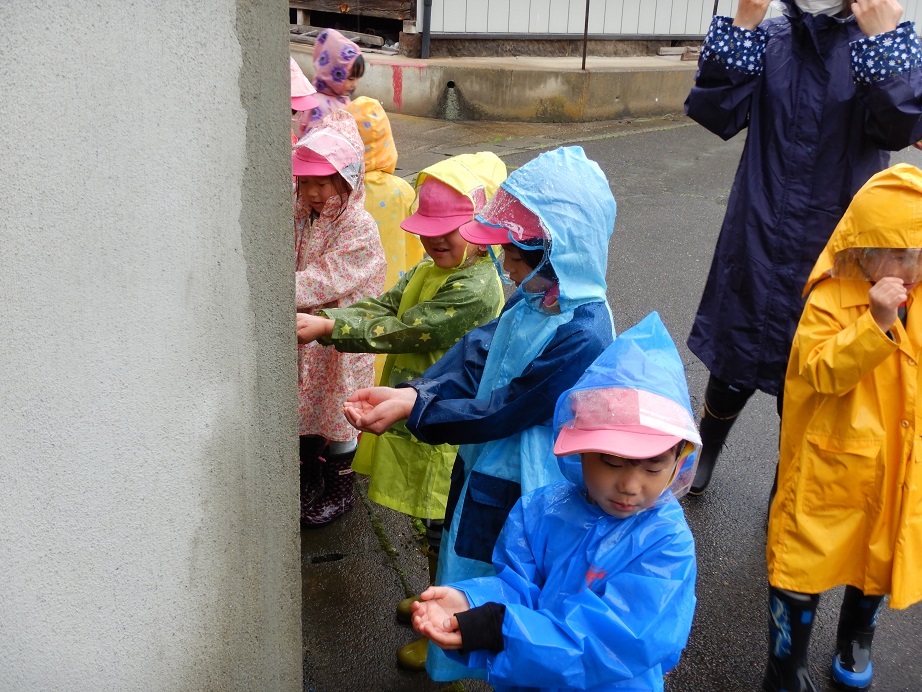 年長さんになると、ただ水たまりや雨の中を楽しむだけでなく、いろいろなことに気が付き、興味を持ったり、不思議さを感じたりすることができるのだと思いました。これからも雨の日にしかできない体験をたくさんし、子どもの興味を広げていけたらと思います。