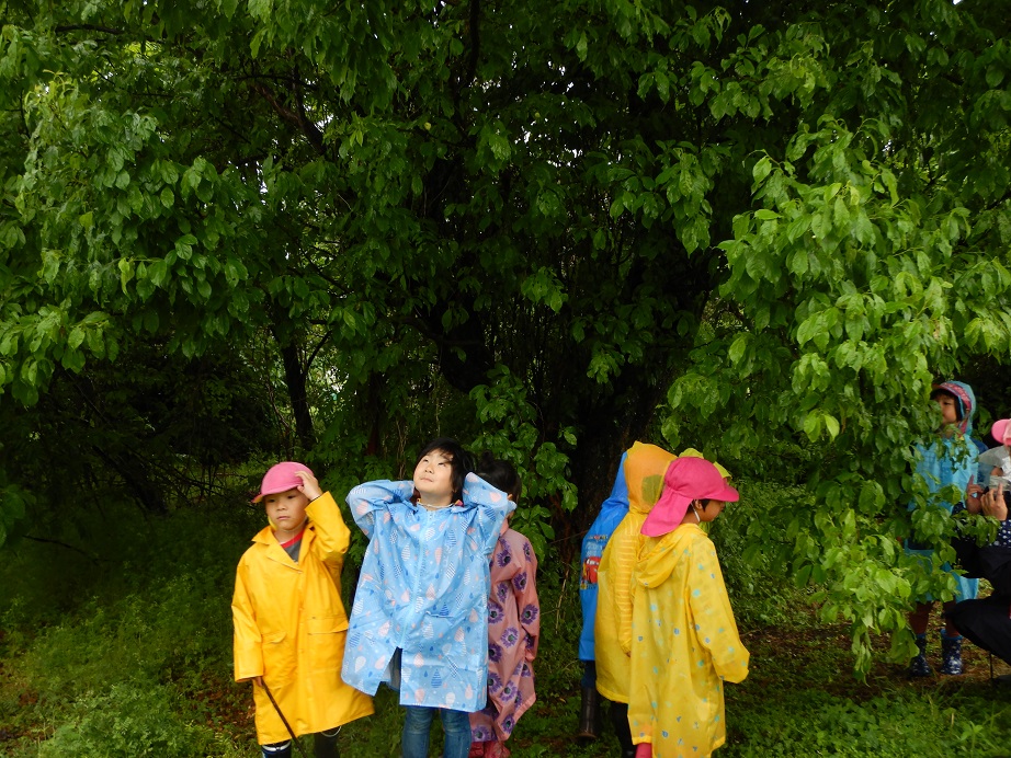 雨が葉っぱに当たるのをしばらく見つめていた子どもたちです。