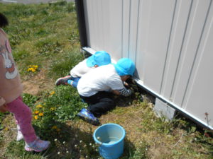 「カネチョロは静かにしてないと出てこないんだよ。」「ダンゴムシは石の下とかすずしいところにいるんだよ。」「メスのダンゴムシは黄色い点々がついているんだよ。」などなど経験を通してどんどん知識もついてきています。身をもって体験することで知ること、覚えていくことがたくさんあります。実体験って大切ですね。