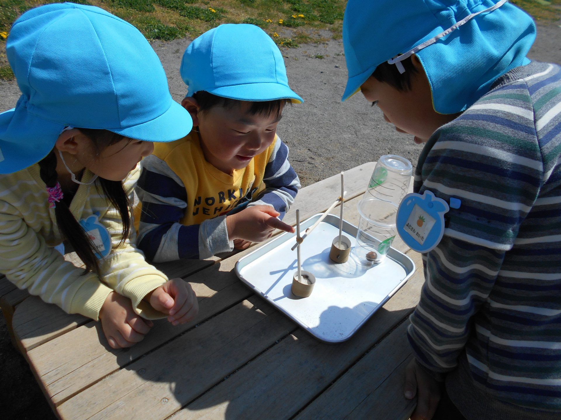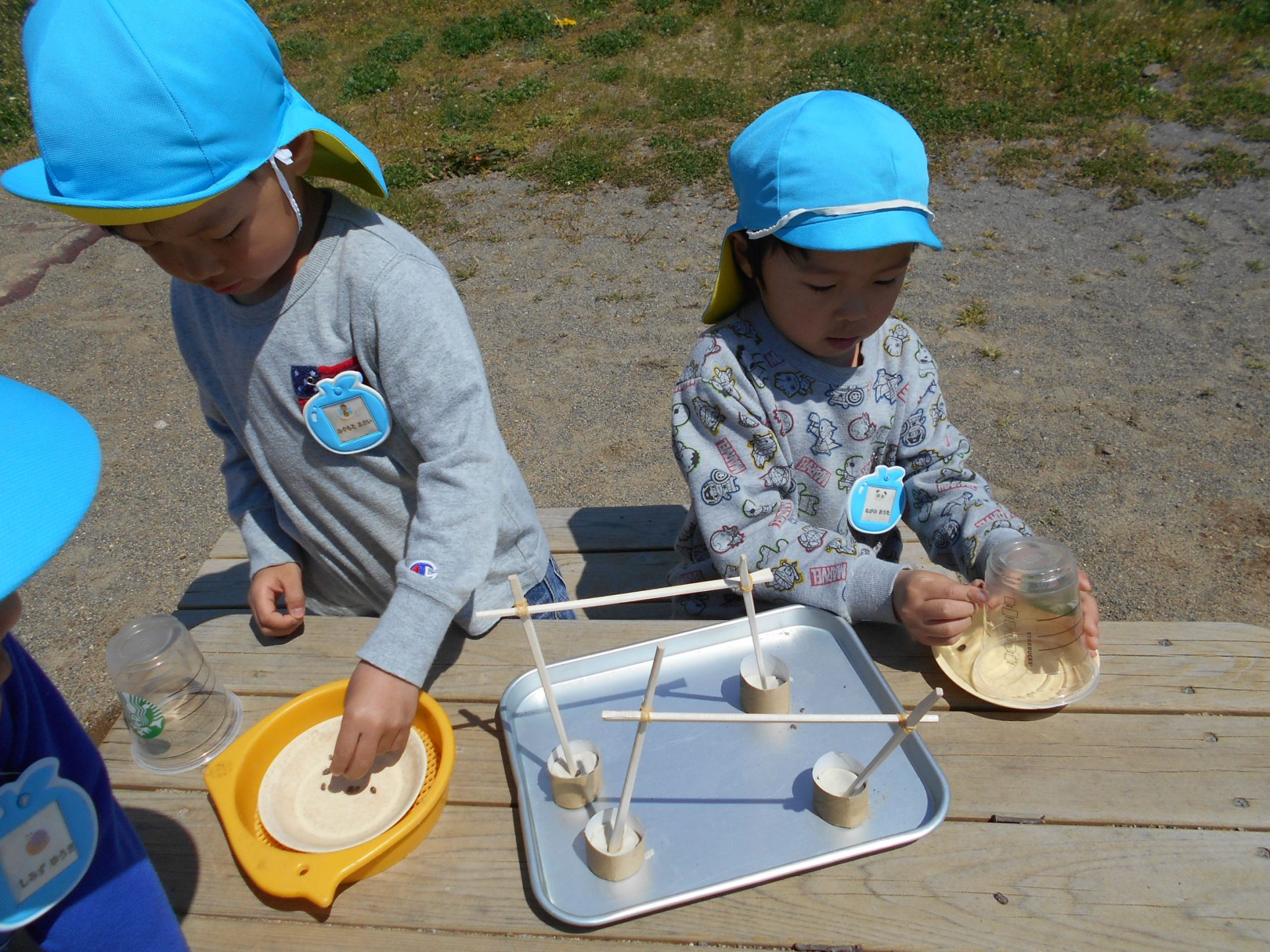 こちらもみんなの人気者のダンゴムシです。クラスで読んだ月刊絵本の中に「ダンゴムシはぶつかりそうになると道を譲ってよける」というのが載っていました。割りばしで実験装置も作って、いざ実験開始。