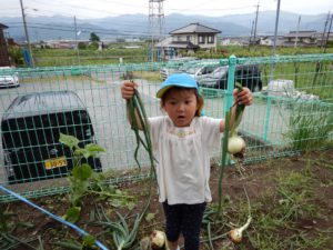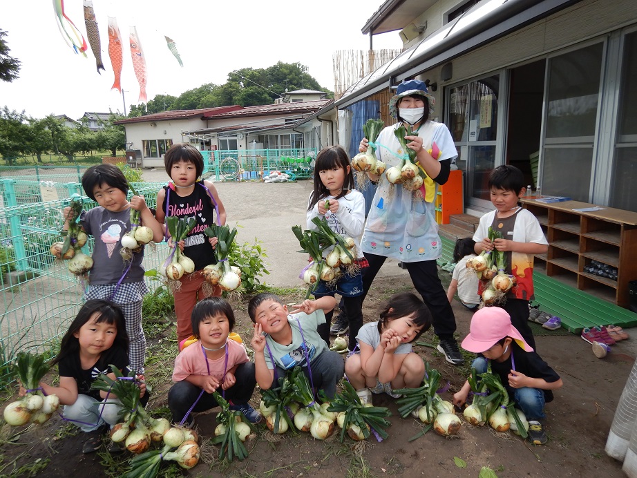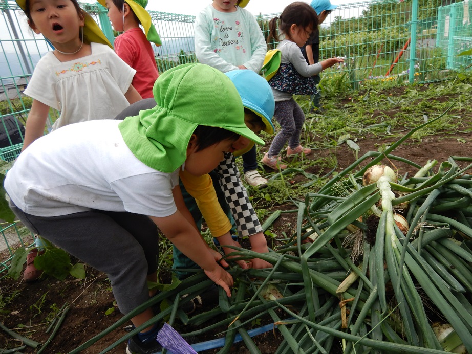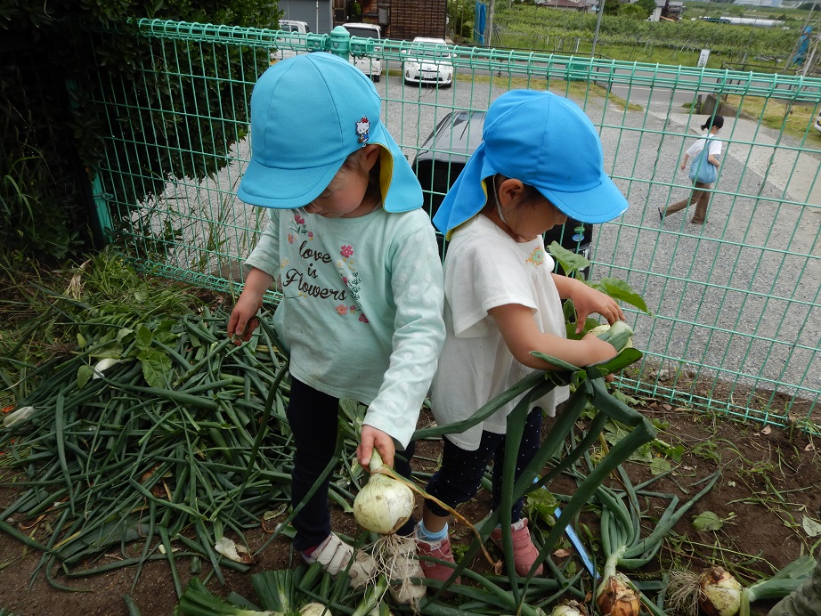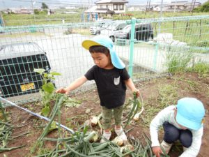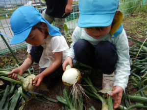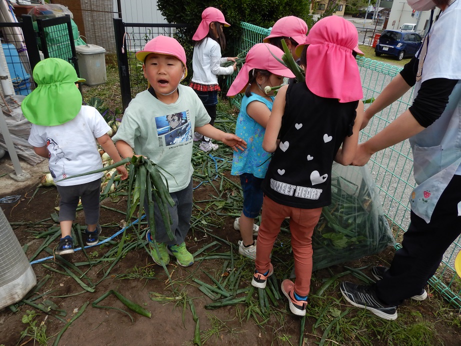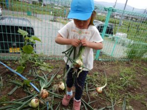 先週、保育園の畑で育った玉ねぎの収穫をしました。