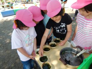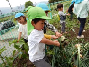 玉ねぎは面白いように抜けるので次から次へと抜いていく子もいました。玉ねぎの葉っぱを手でちぎり玉ねぎの葉っぱはヌルヌルすることを知ったり、畑の土の上にあった玉ねぎの葉っぱを踏んでしまい、しりもちをつき葉っぱが滑る事も知りました。玉ねぎの収穫をしながら、たくさん玉ねぎに触れることができ良い経験になったと思います。玉ねぎは給食に入れてもらい味わったり、玉ねぎの皮で染物をしたり、楽しんでいきたいと思います。