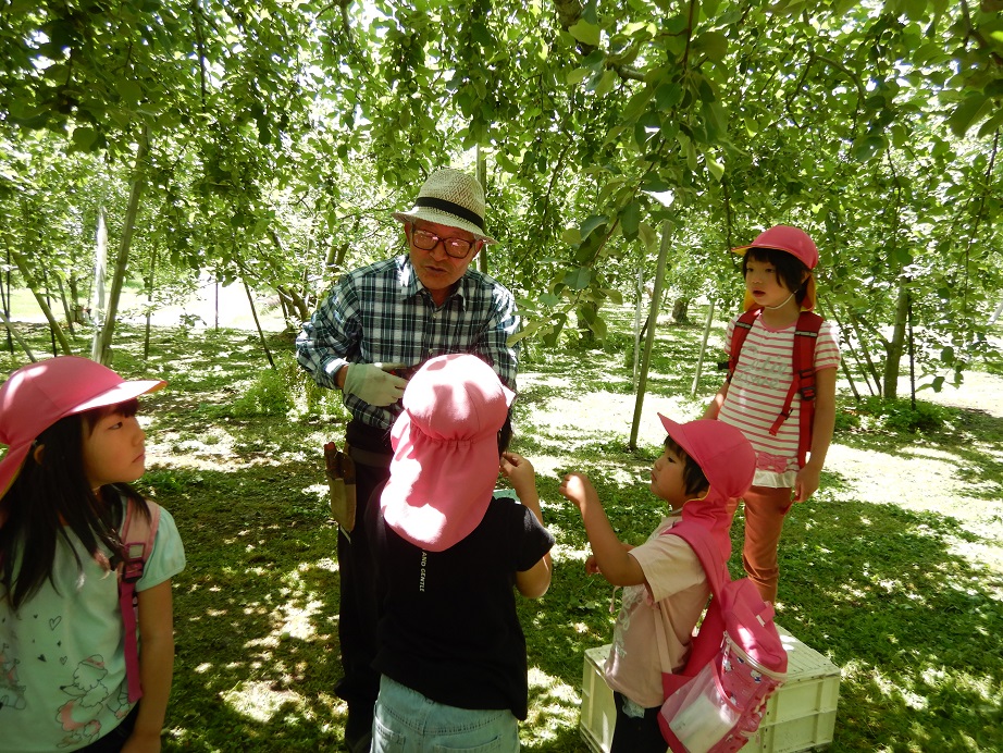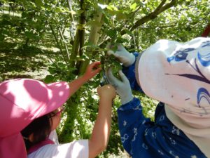 リンゴの花の受粉をさせてもらっってから、あっという間に小さなリンゴになり、小さくても少し赤くなってきていることに気が付いた子どもたちでした。
