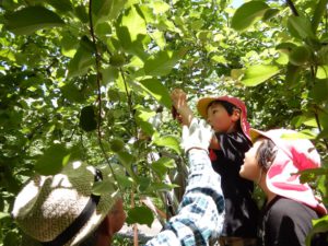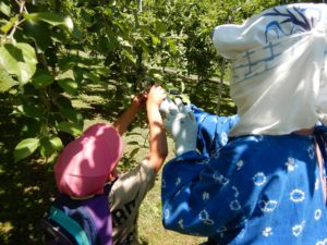 子どもたちは畑に落ちた摘果のリンゴをポケットにしまって嬉しそうにお土産にしました。